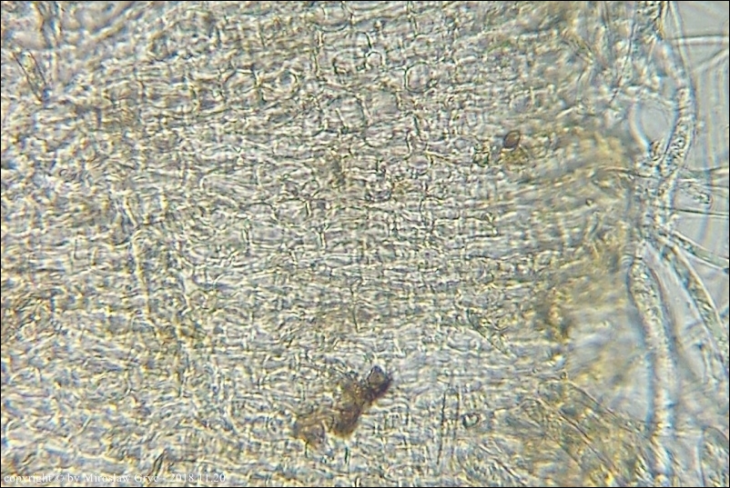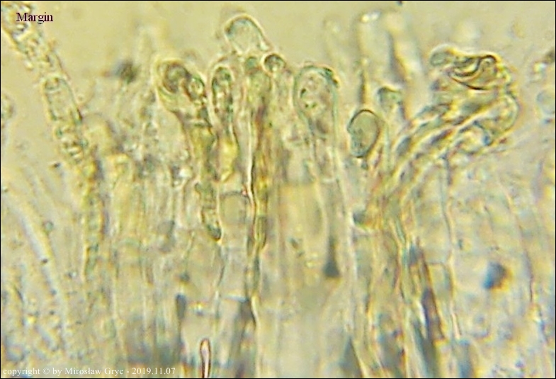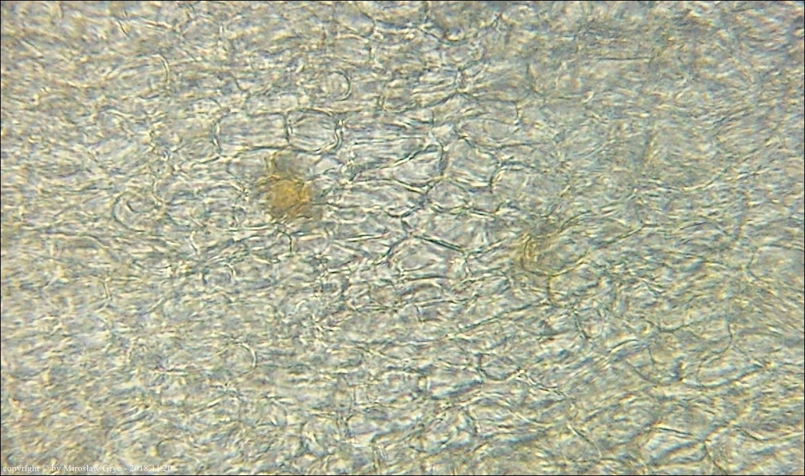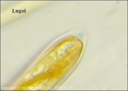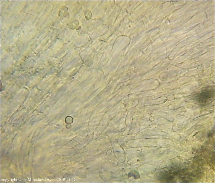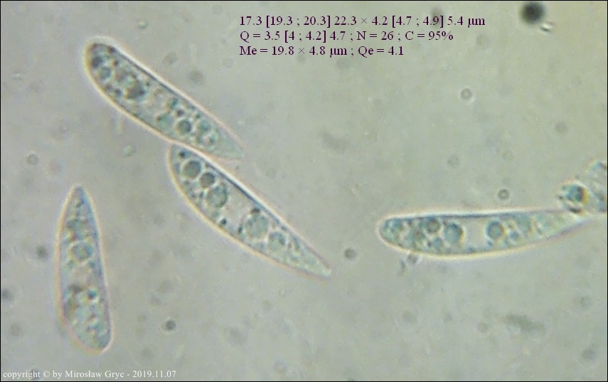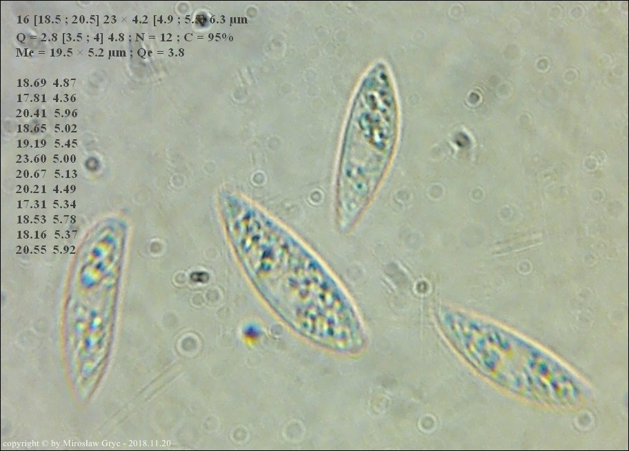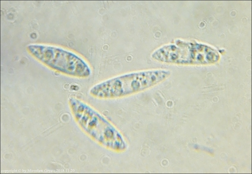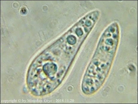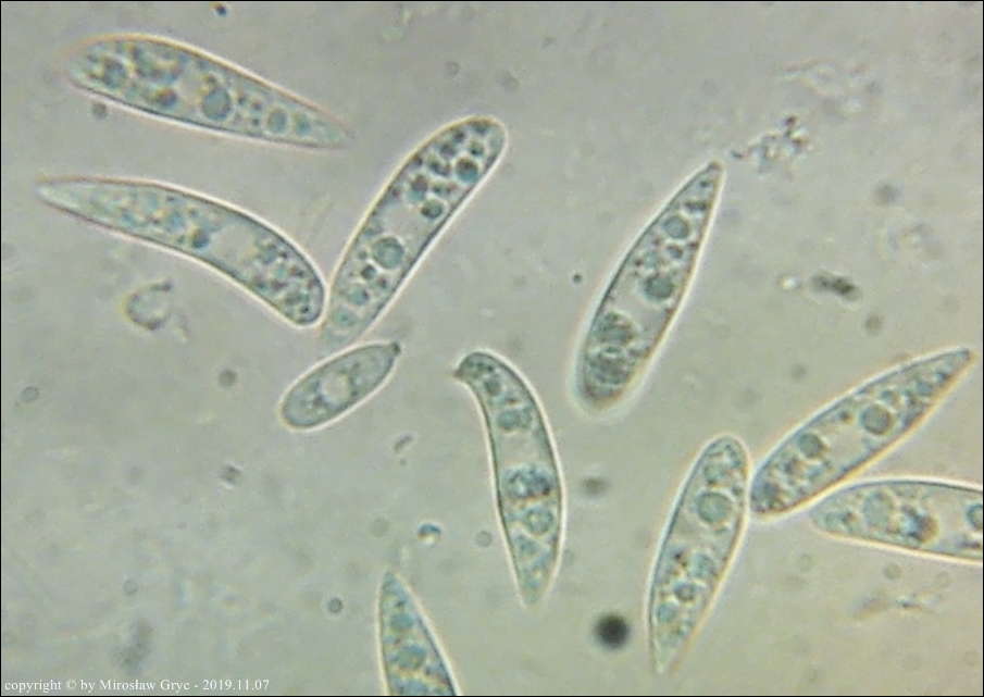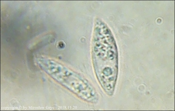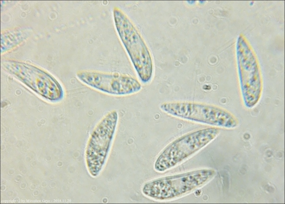 Inny dostępny opis z kolei przedstawia je jako szereg małych kropel rozmieszczonych po obu końcach zarodnika. Ta wersja jest bardziej zbliżona do opisu mojej kolekcji. Z kolei w nieoficjalnym kluczu Barala zawartość kropli opisana jest jako; jedna średni i kilka małych kropel po każdej ze stron zarodnika. Ze względu jednak na to, że ilustracje zarodników tego gatunku ukazują też nieco inne rozłożenie kropel wewnątrz zarodników, umieszczam tę kolekcję z adnotacją "cf"!