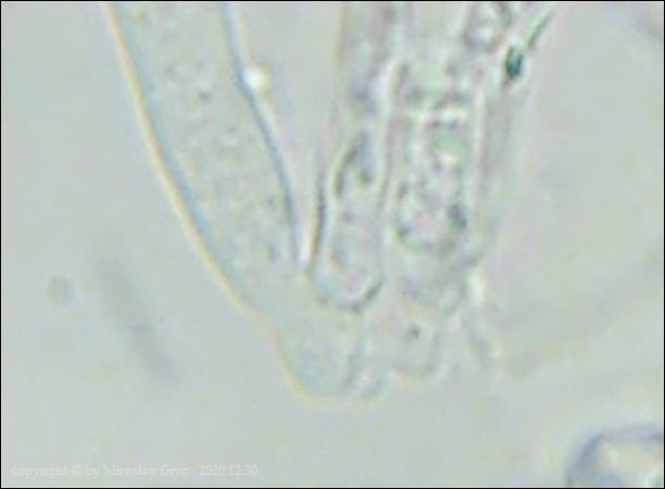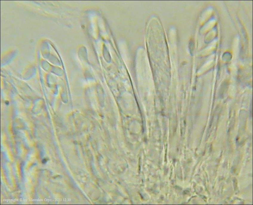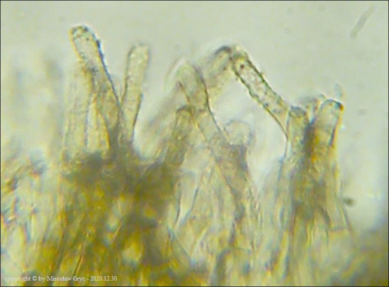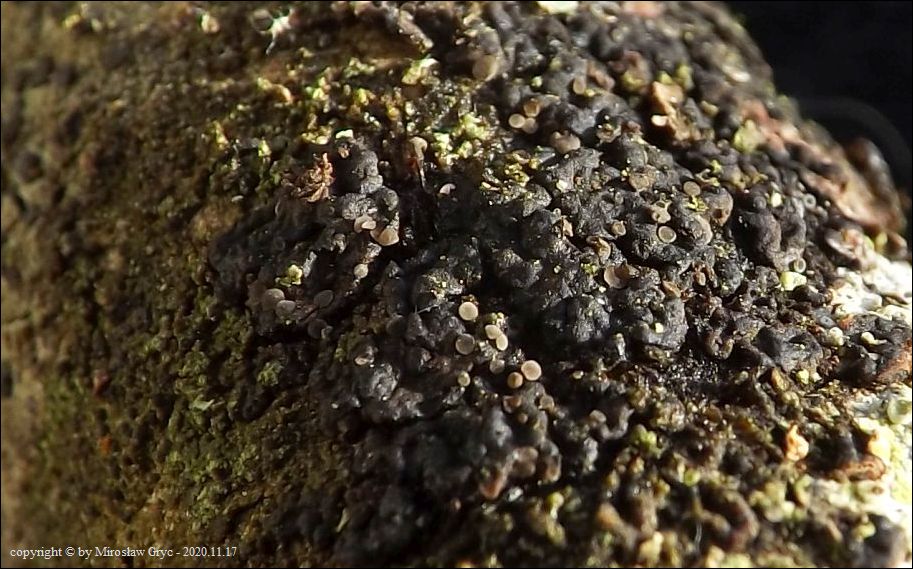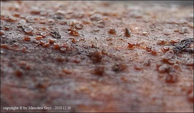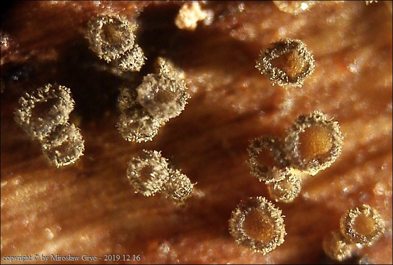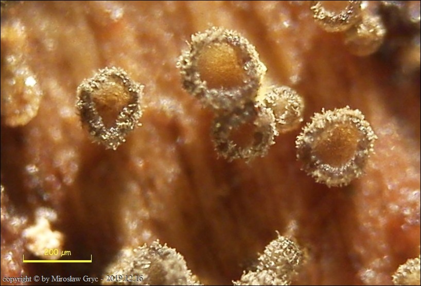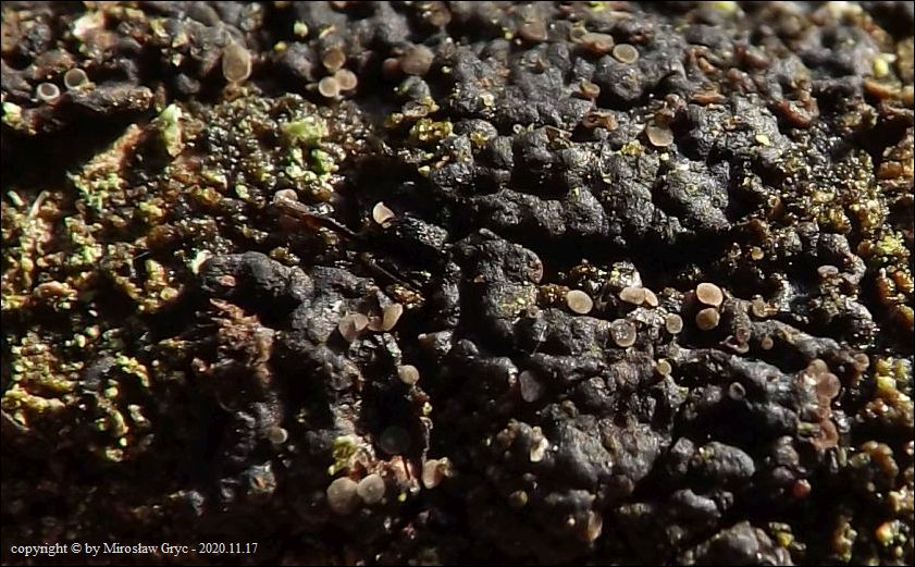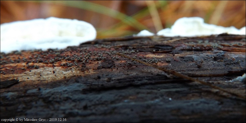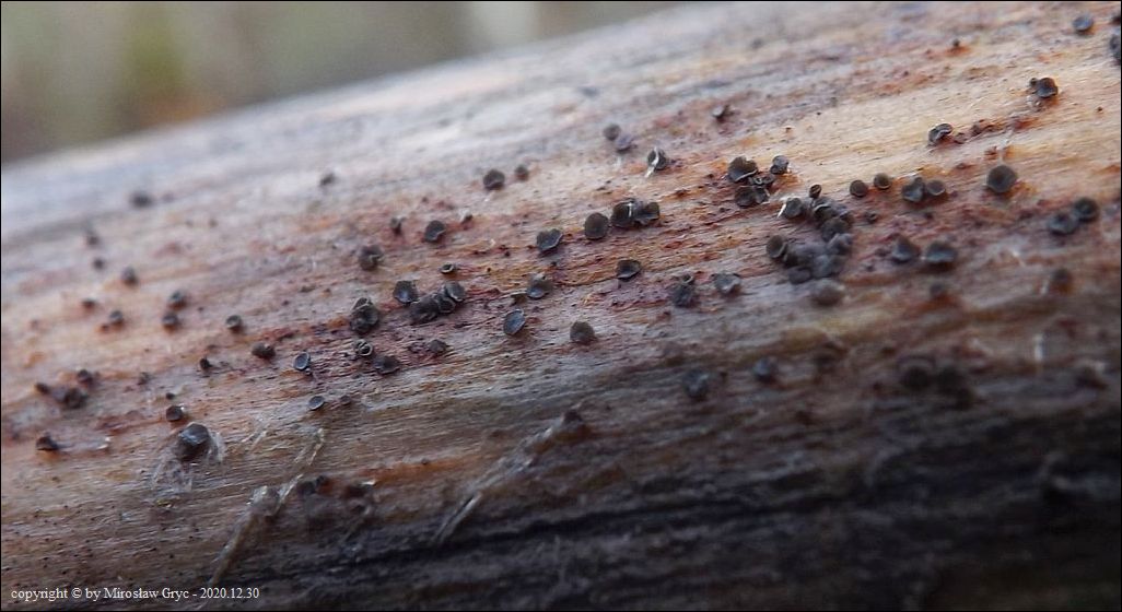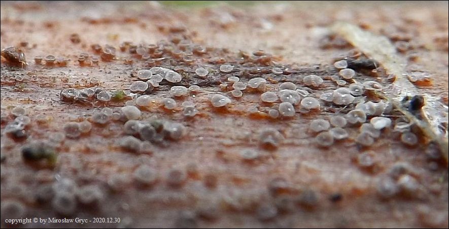 Substrat: Owocniki na obumarłej gałązce topoli, wyrastające na korze, martwych porostach