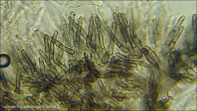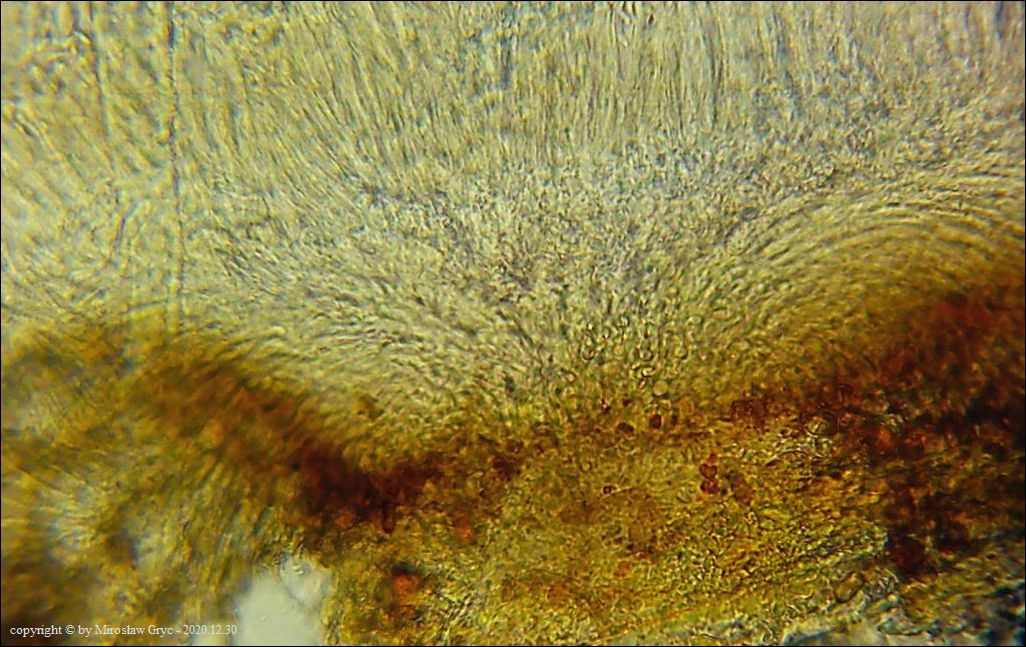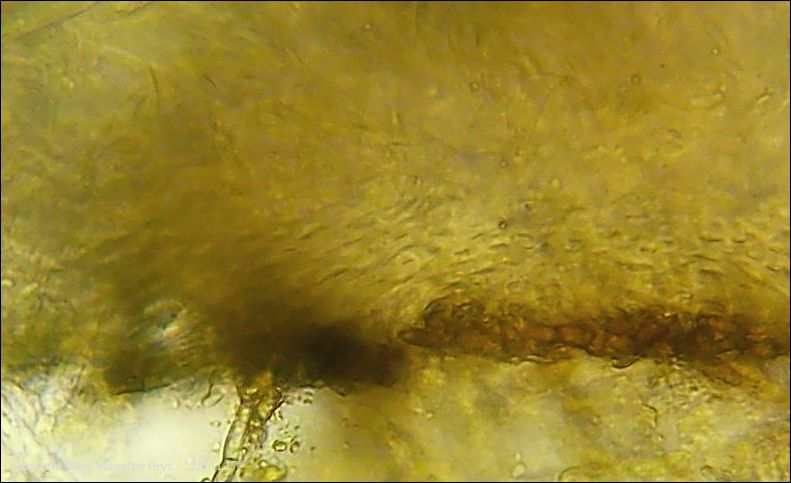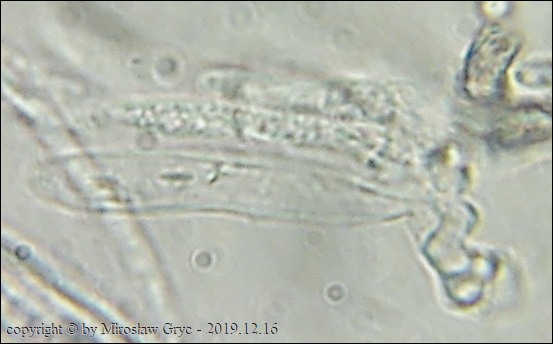 oraz na obumarłych pozostałościach po Peniophora sp. (możliwa P. polygonia).
