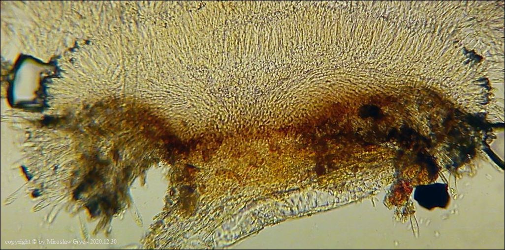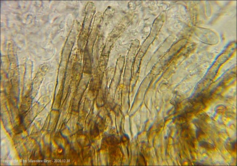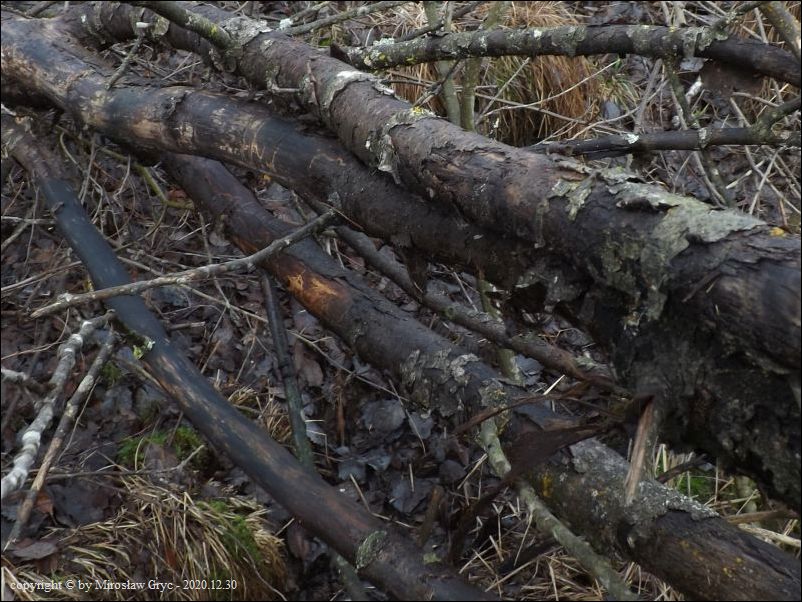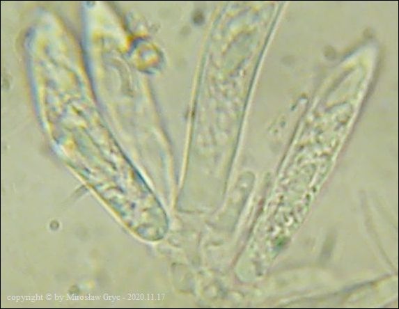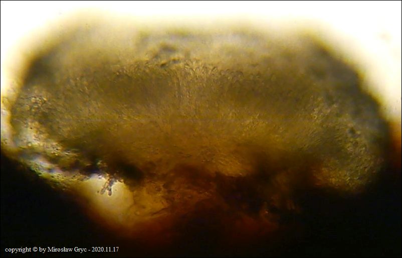 Substrat: Owocniki na dolnej stronie pnia młodej, złamanej topoli, leżącej na ziemi.
