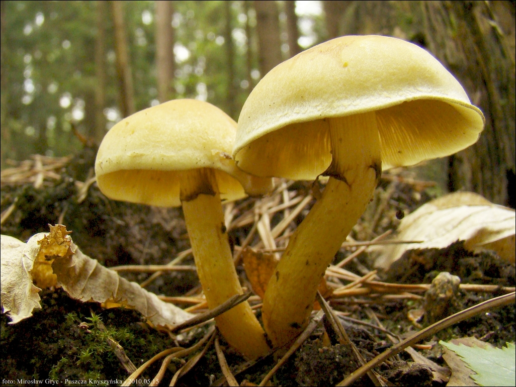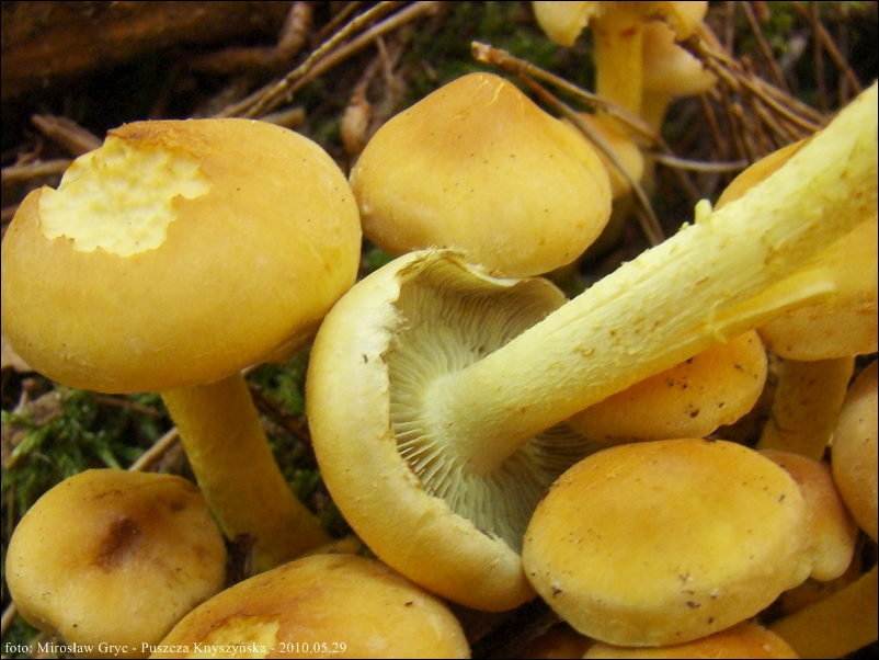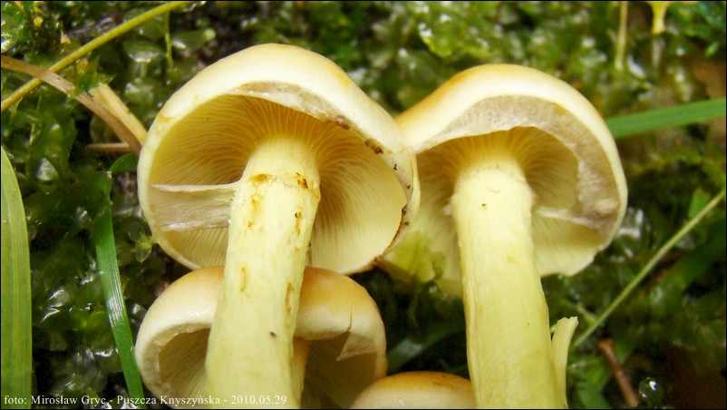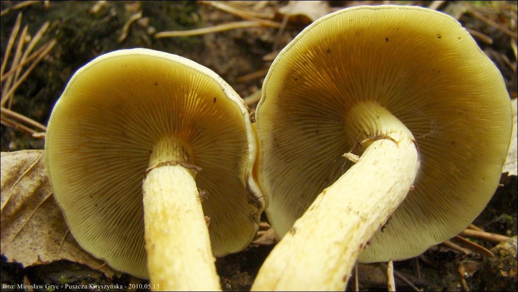 łuskwiak żółty (Pholiota flavida), blaszki nigdy nie ciemnieja, zawsze pozostają żółtawe lub pomarańczowoczerwone.