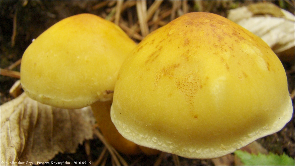 Kapelusz: zazwyczaj nie przekracza średnicą 7 cm. Zabarwiony na żółto lub żółtopomarańczowo, w centrum przeważnie nieco ciemniejszy, powierzchnia gładka i sucha, nie higrofaniczny; za młodu kształtu wypukłego, później spłaszczony; brzeg z widocznymi resztkami osłony, .