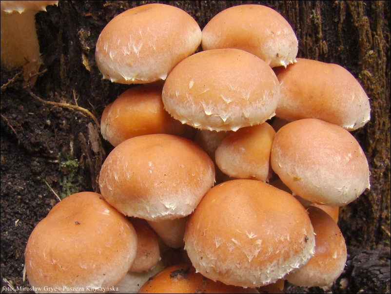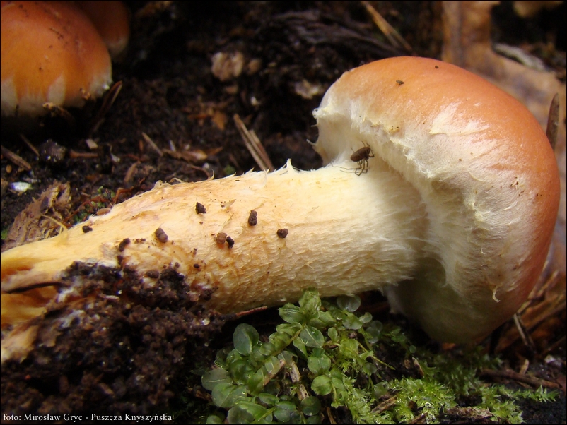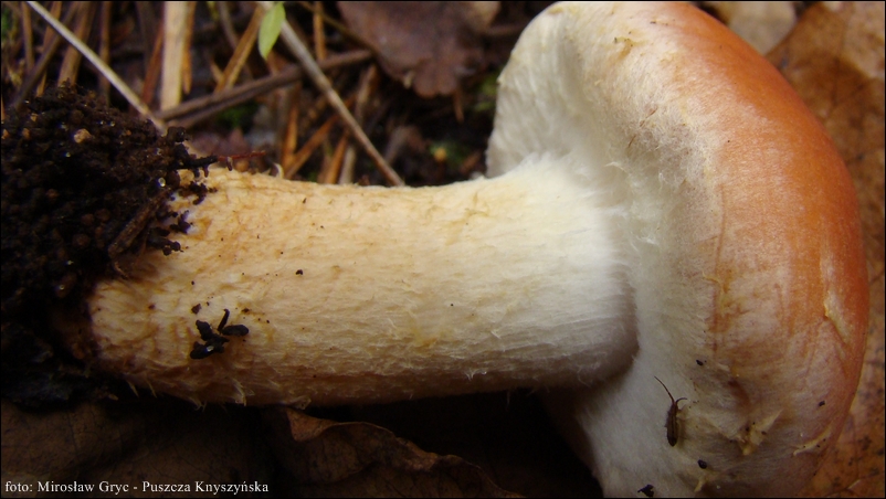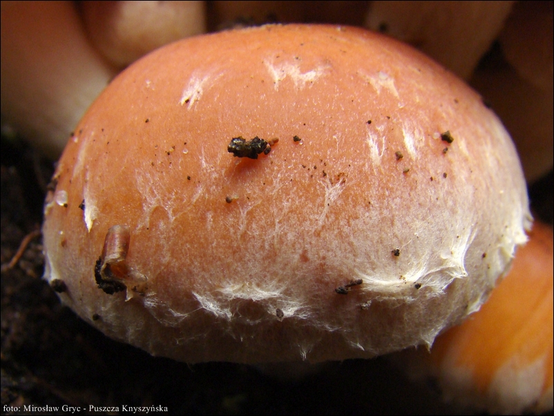 Kapelusz: dorastający do średnicy nawet 12 cm, na szczycie ceglastoczerwony, brzeg zdecydowanie jaśniejszy, z widocznymi szczególnie u owocników młodych resztkami osłony; powierzchnia gładka i sucha.