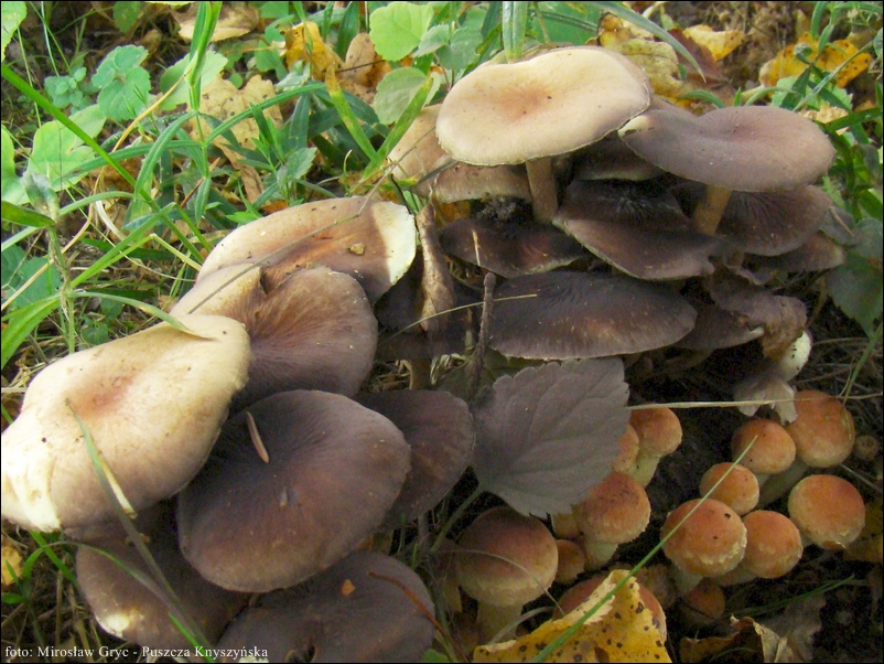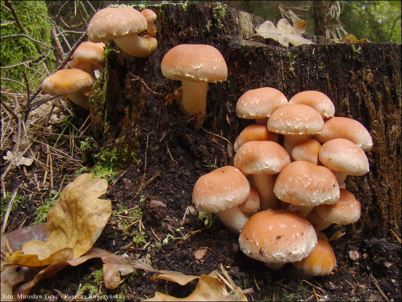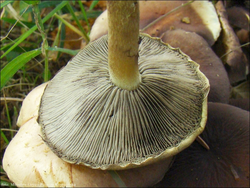 Blaszki: początkowo białawe, później oliwkowe aż do szarozielonych, gęste, przy trzonie zaokrąglone.