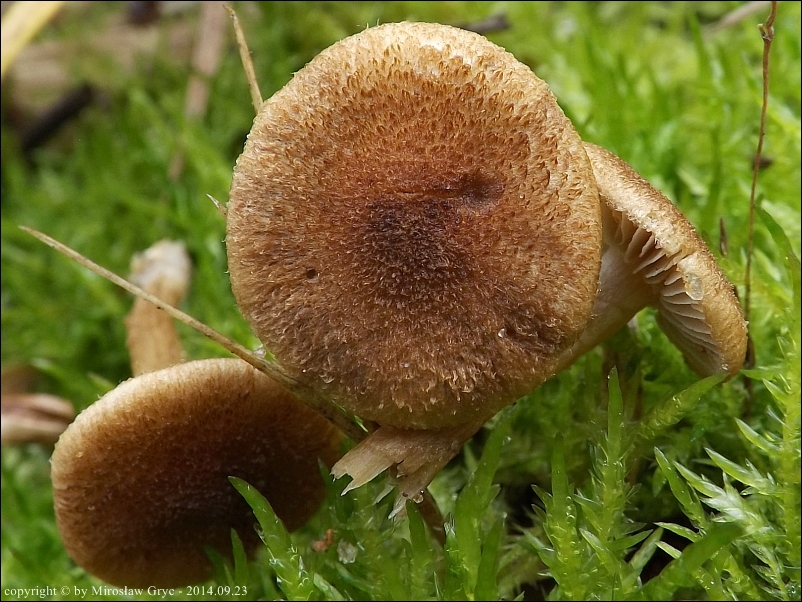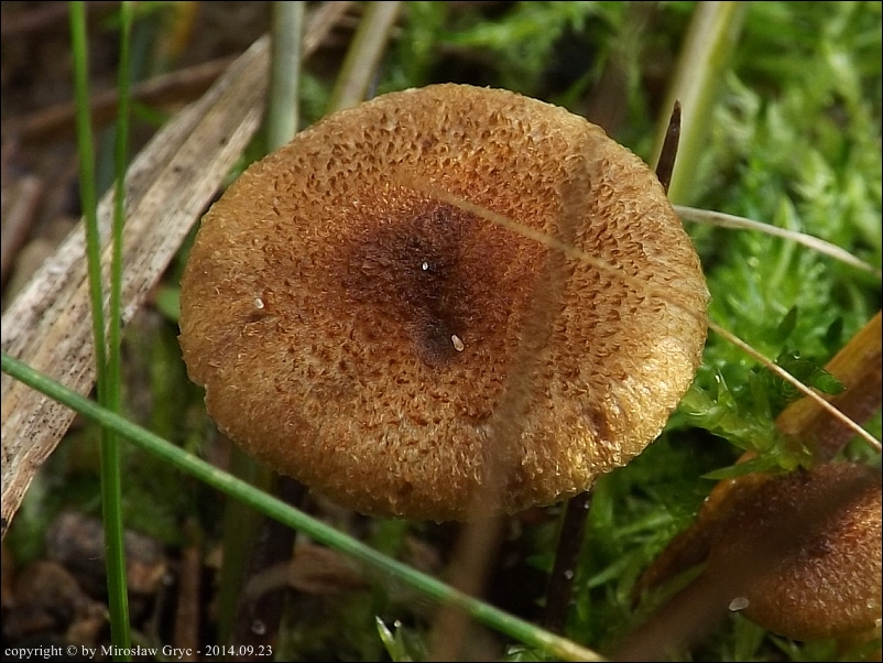 Kapelusz: średnicy 2-4 cm, początkowo dzwonkowato wypukły, do zupełnie płaskiego a nawet wklęsłego; brzeg od lekko podwiniętego do prostego u owocników dojrzałych; powierzchnia sucha, kosmkowato-włókienkowata ale nie pasemkowata, barwy beżowordzawej z odcieniem oliwkowym, rzadziej oliwkowobrązowej.