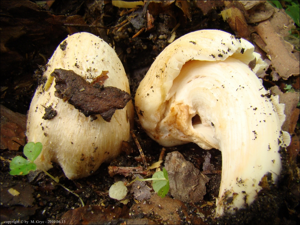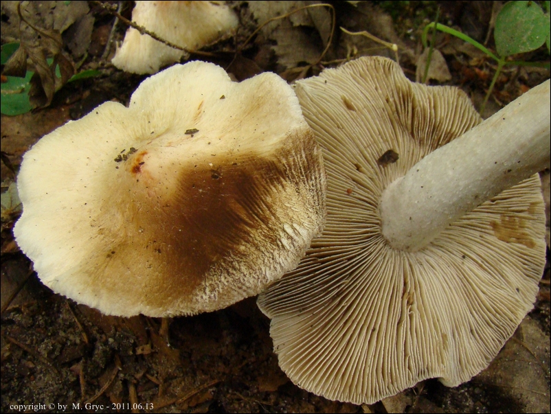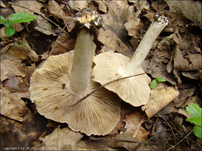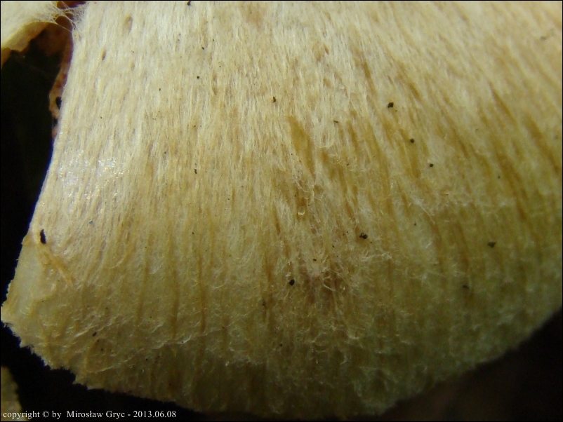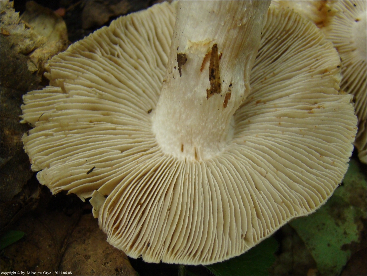 Blaszki: początkowo białawe, następnie kremowe (różowiejące), aż w końcu szarawo zabarwione przez zarodniki, wąsko wykrojone; ostrze biało orzęsione.