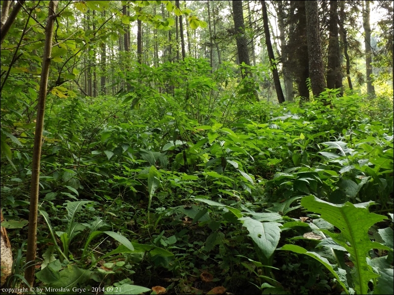 Siedlisko: Olsza, rzadziej świerk, podłoże wilgotne, gęsto porośnięte ostrożeniem warzywnym.