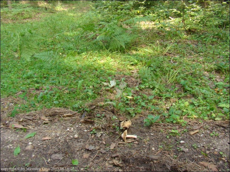 Siedlisko / Substrat: Dwa owocniki na skraju koleiny drogi leśnej, z dala od drzew (w oddali las mieszany).