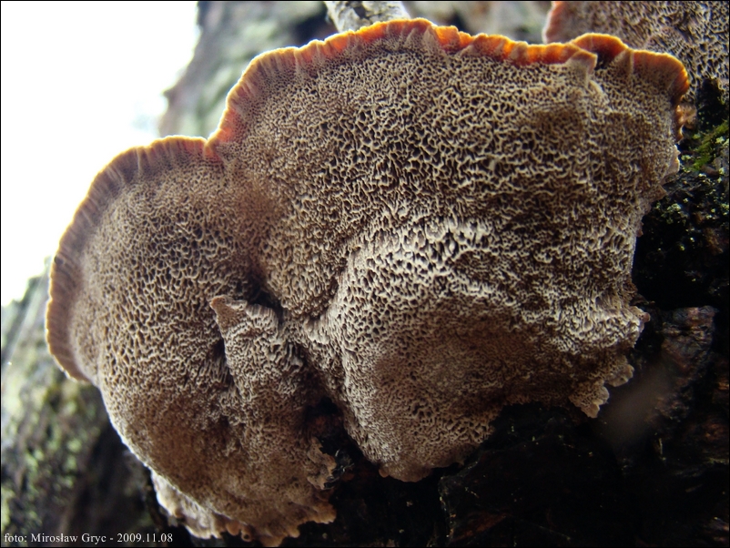Kształt owocników w dużej mierze uzależniony od miejsca wzrostu. W większości przypadków znajduje je rosnące na powierzchni bocznej (pionowej) substratu, gdzie z reguły wytwarzają owocniki o kształcie konsolowatym i półkolistym zarysie, bokiem mocno przyrośniete do podłoża i przeważnie nieco po nim zbiegające. Rzadziej znajduje się owocniki rosnące na powierzchniach pionowych (na pniakach w miejscu cięcia), wówczas zazwyczaj przybierają kształt owalny, plackowaty lub też wzniesiony na jakby grubym trzonie utworzonym z warstwy hymenoforu.