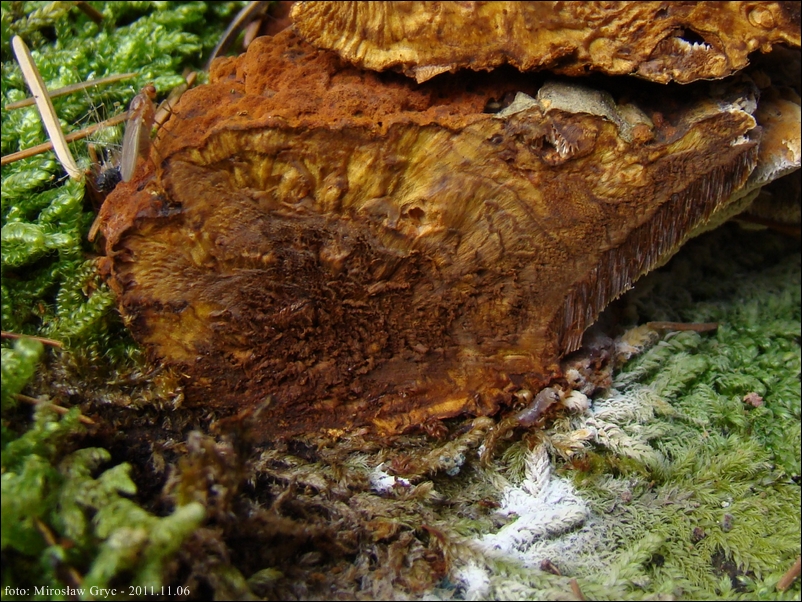 Hymenofor w zasadzie o nieco jaśniejszym ubarwieniu w stosunku do wierzchu kapelusza. Składa się z rdzawych rurek, o długości osiągającej 1 cm, których ostrza zazwyczaj są srebrzyście oszronione.