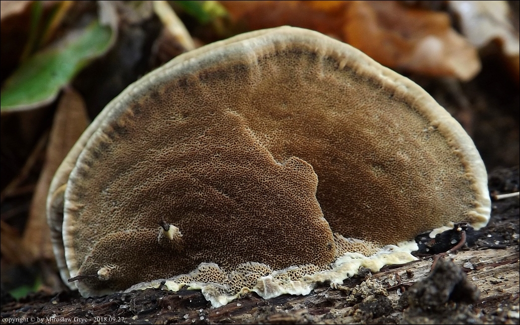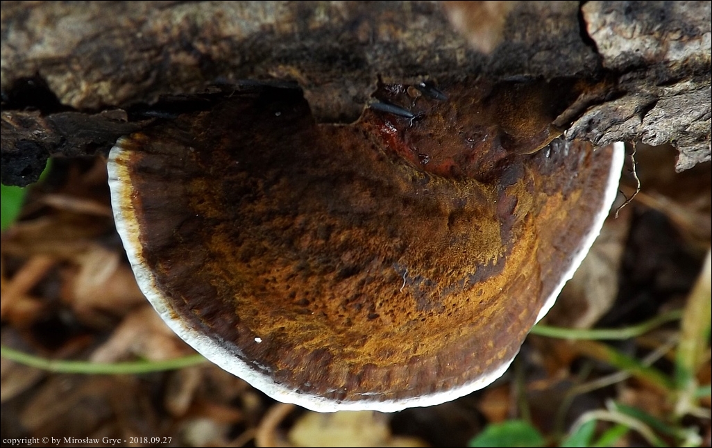 Wierzch kapelusza o bardzo zmiennym ubarwieniu w zależności od wieku owocnika. Najlepiej ta zależność widoczna na zdjęciach zamieszczonych w galerii gdzie prezentuje owocniki w różnych fazach wzrostu. Bardzo atrakcyjnie wyglądają egzemplarze młode na których powierzchni dość często możemy zaobserwować wydzielanie sie kropel ciemnej cieczy (zjawisko zwane gutacją), tym bardziej, że w tym wieku, sam owocnik jest jasno ubarwiony. Młode owocniki przeważnie o kształcie nieregularnych tworów, stopniowo zaczynają osiągać właściwy kształt w którym zaznacza się coraz bardziej granica pomiędzy wierzchem a warstwą hymenoforu. Przybierając kształt konsolowaty, również zmienia się jego zabarwienie. Górna warstwa ciemnieje aż do barwy rdzawoochrowej, zazwyczaj ze znacznie jaśniejszym brzegiem. W tym etapie wzrostu jej struktura staje się chropowata, promieniście pomarszczona lub guzkowata.