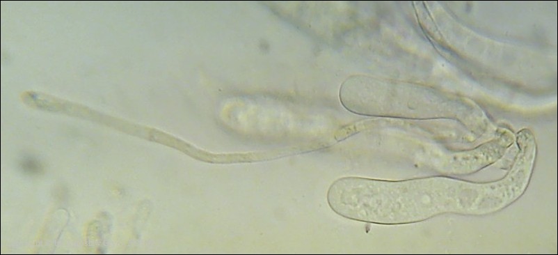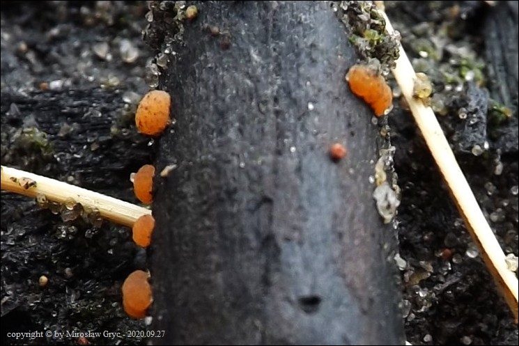 Substrat: Owocniki na niewielkim fragmencie gałązki nieznanego pochodzenia, leżącego na węglu pozostałym po palonym ognisku.
