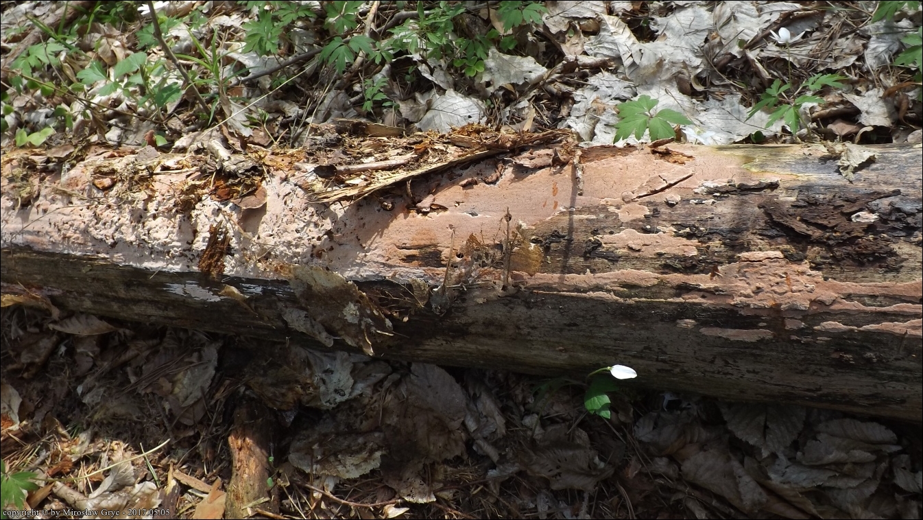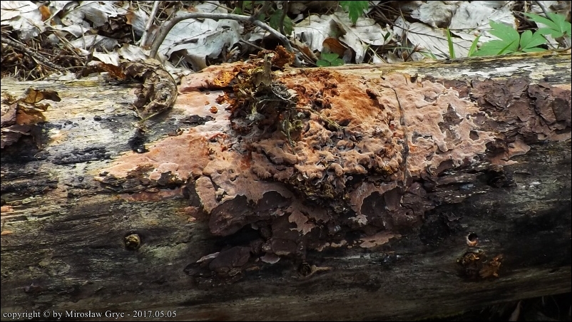 Substrat: Owocniki na dolnej stronie leżącego na ziemi pnia sosny.