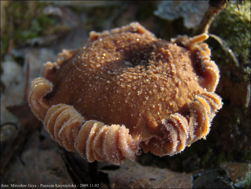 cienki, średnicy od 1.5 do 5 cm; początkowo półkolisty, stopniowo rozpościerający się aż do płaskiego, zazwczaj z małym wklęśnięciem w centralnej części; barwy mięsnoróżowej, brązoworóżowej lub cielistoochrowy, pod wpływem warunków atmosferycznych bardzo często wyblakły; powierzchnia kapelusza początkowo gładka, następnie pokrywa się drobnymi łłuseczkami o barwie kapelusza.