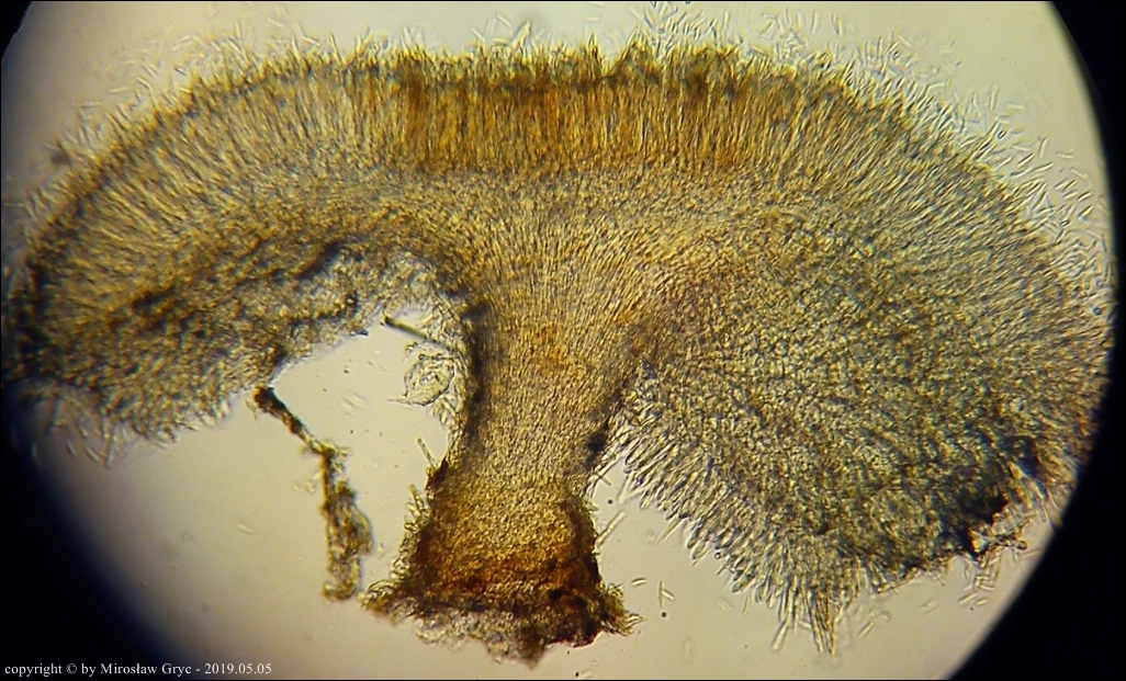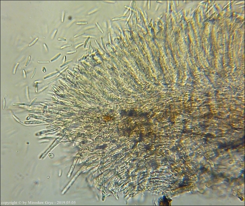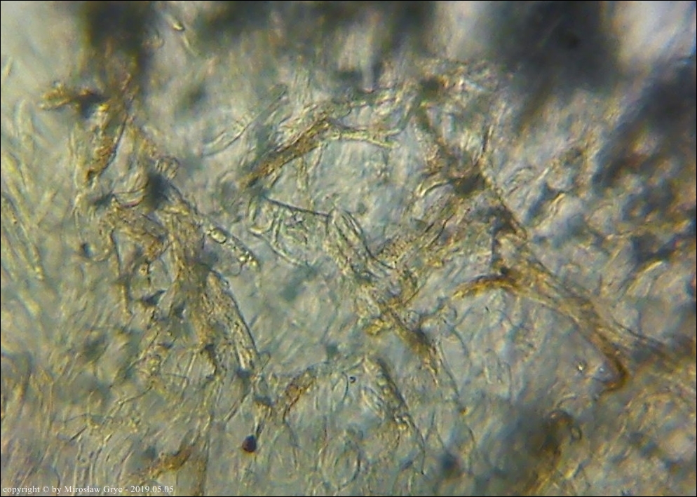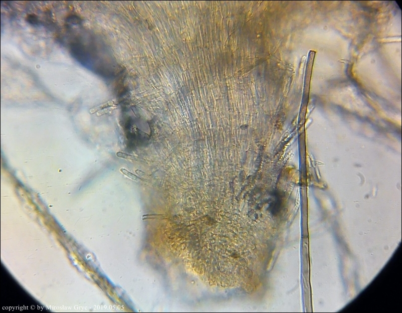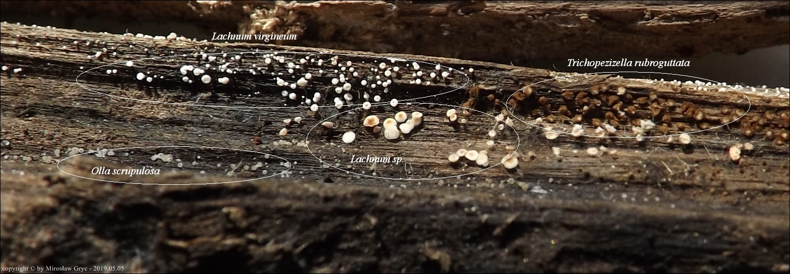 Substrat: Owocniki na dolnej stronie kawałka drewna leżącego na błotnistej ziemi.