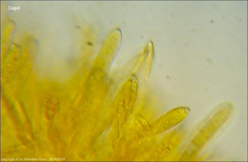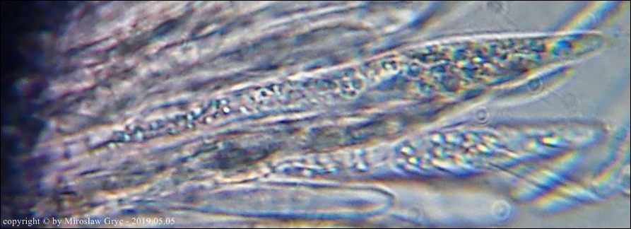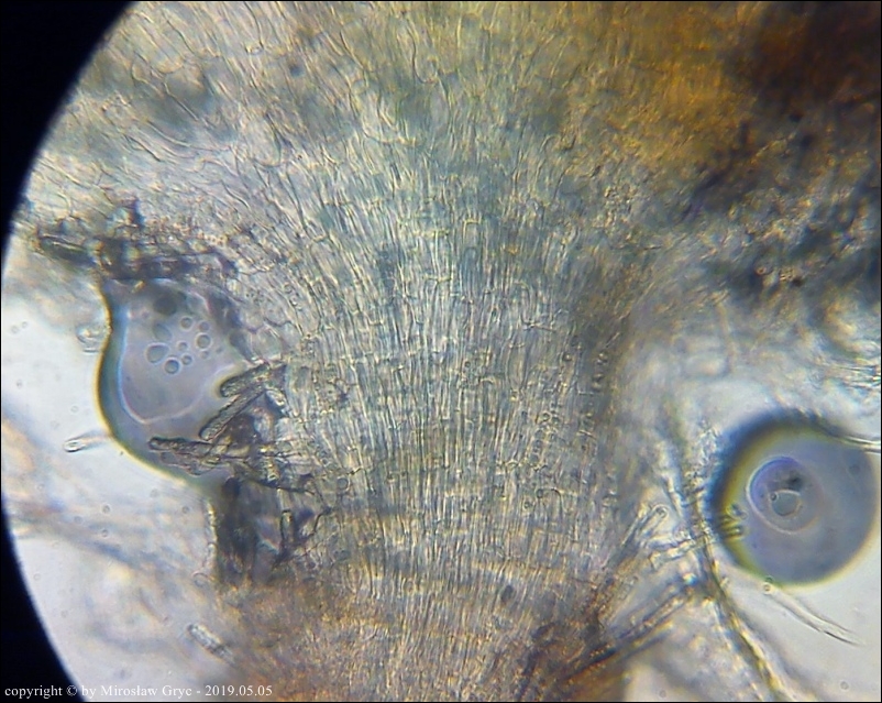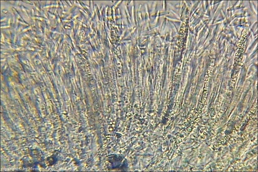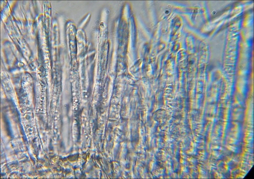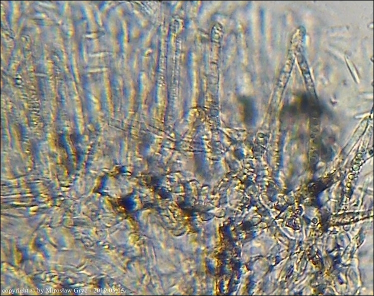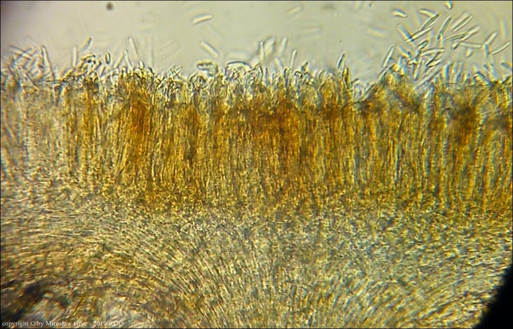 Substrat: Owocniki na dolnej stronie kawałka drewna leżącego na błotnistej ziemi.