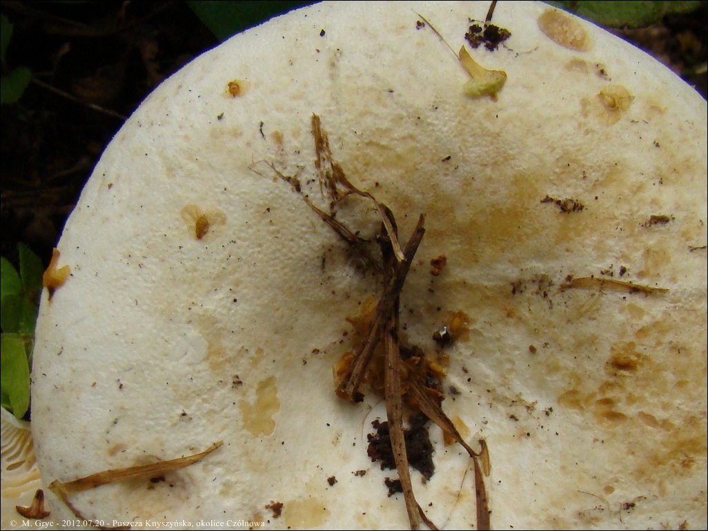 10-20 cm, początkowo wypukły lub płaskowypukły, zazwyczaj już w bardzo młodym wieku wyraźnie, centralnie zapadnięty; brzeg mocno i długo podwinięty, nawet w starszym wieku częściowo takim pozostaje; powierzchnia kapelusza biała, z ochrowymi plamami, delikatnie omszona, matowa, w czasie suchej i słonecznej pogody pęka na drobne poletka.