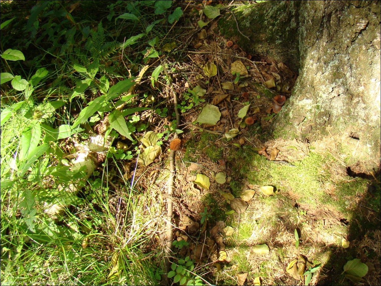Substrat: Grupka owocników na wybrzuszeniu terenu wokół brzozy.