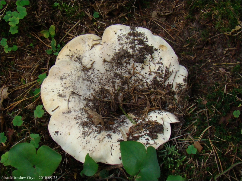 średnicy nawet do 30 cm, barwy białej lub białawej, zazwyczaj wklęsły; powierzchnia sucha i matowa, dość często zanieczyszczona, ponieważ zazwyczaj rozwija się jeszcze przed wyjściem na powierzchnię ściółki, tym samym unosi jej część na kapeluszu; brzeg dość długo pozostaje podwinięty.