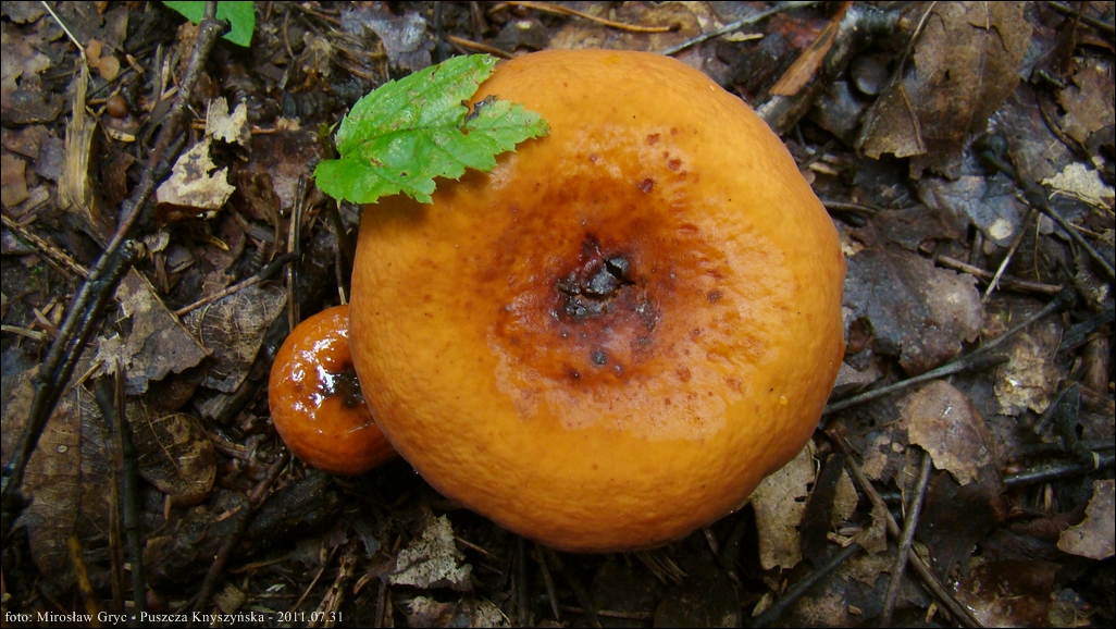 zazwyczaj o średnicy 5-10 cm, z centarlnym wgłębieniem; powierzchnia sucha, gładka i matowa, zabarwiona na pomarańczowoczerwono lub pomarańczowobrązowo; brzeg długo podwinięty.