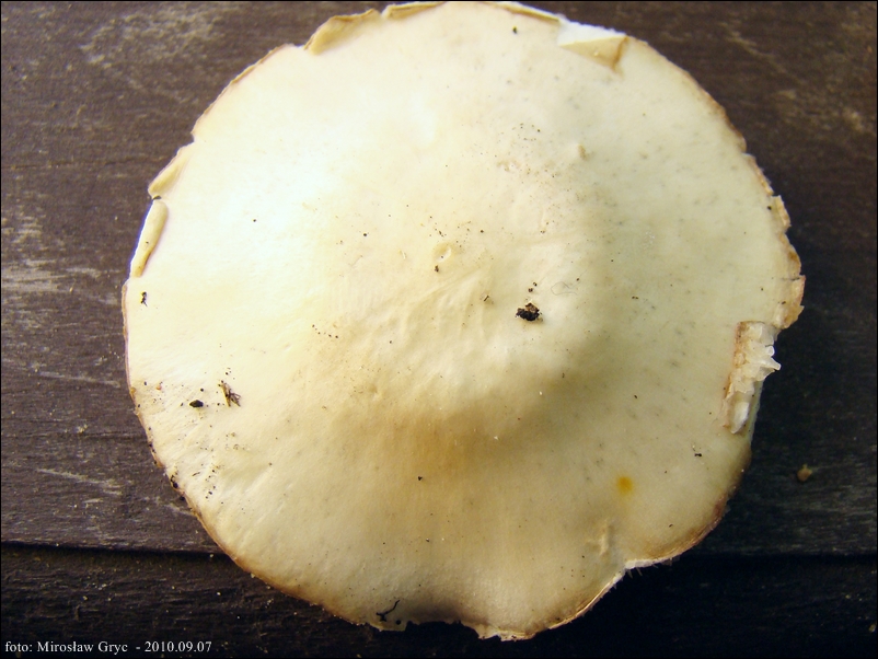 średnicy 3 - 10 cm, czasem nawet do 20 cm; początkowo półkolisty, przeważnie ze spłaszczonym wierzchem, w miarę wzrostu wypukły do rozpostartego, barwy białej lub białawej, czasen z poszarzałym centrum; brzeg ostry, wystający poza blaszki, słabo podwiniety jedynie w młodym wieku i niekiedy ze zwisającymi resztkami osłony; powierzchnia u młodych owocników drobno włókienkowata, jakby aksamitna, u starszych gładka, matowa i sucha.