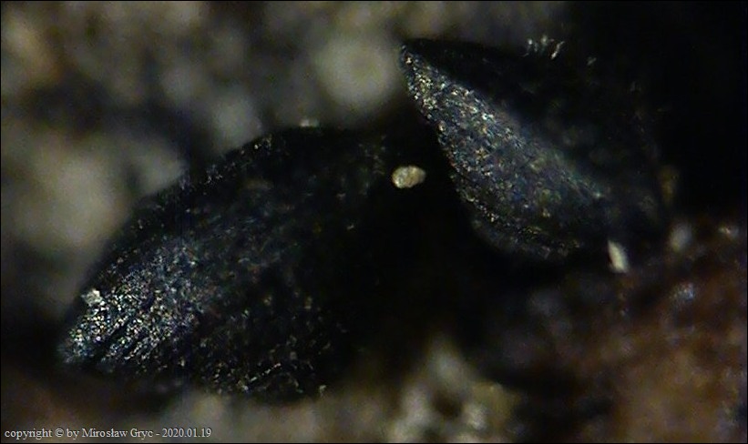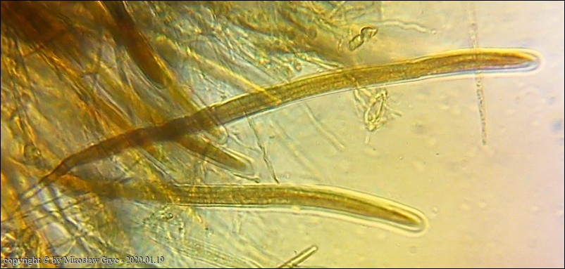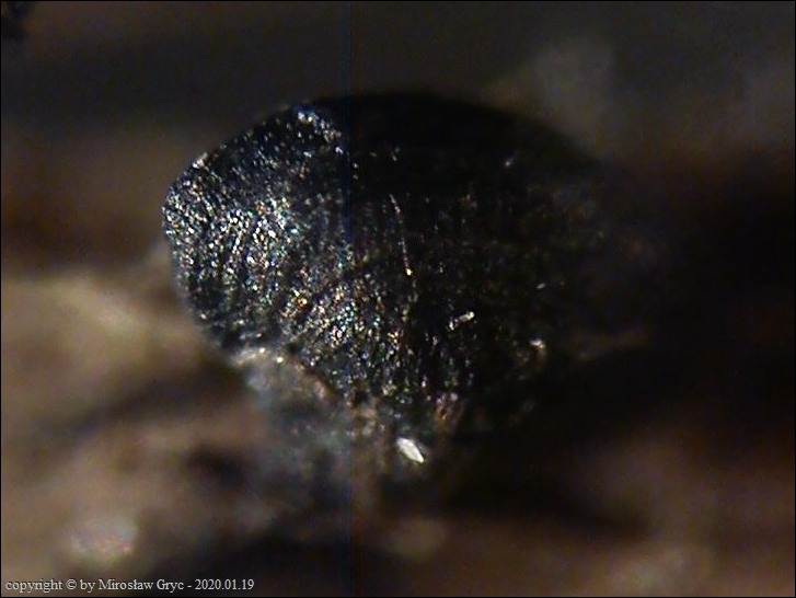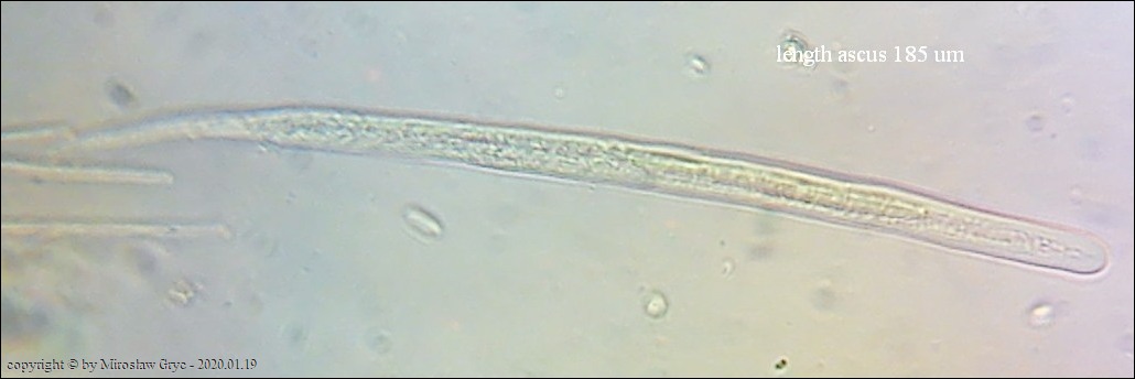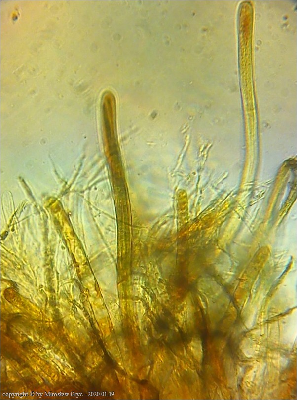 Substrat: Kilka owocników na dolnej stronie niewielkiego fragmentu drewna, nieznanego pochodzenia, leżacego na ściółce.