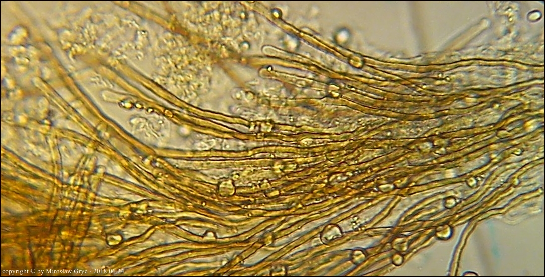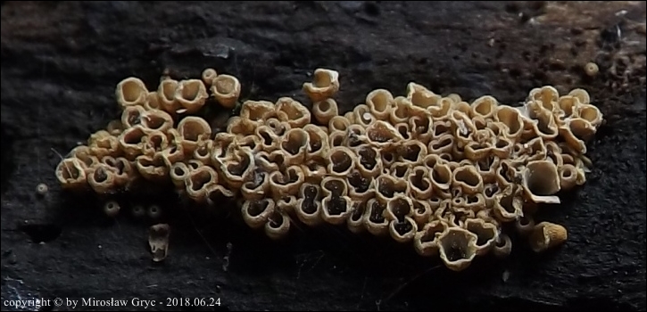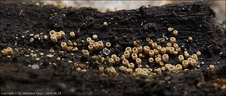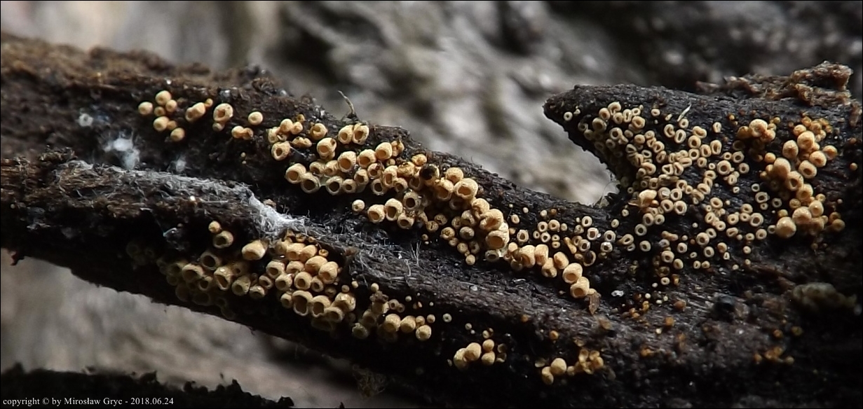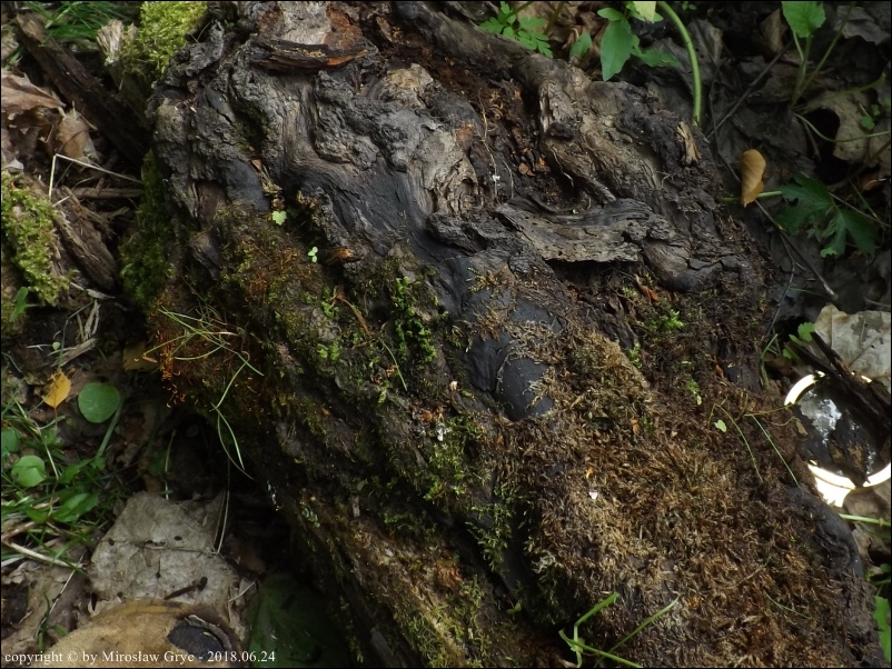 Substrat: Owocniki na fragmencie drewna nieznanego pochodzenia, leżacym na wilgotnej ziemi.