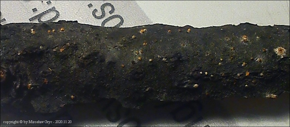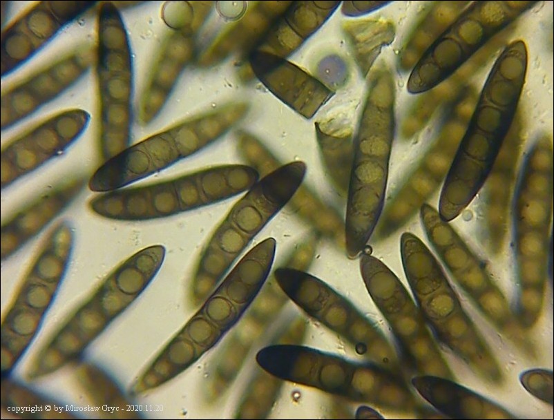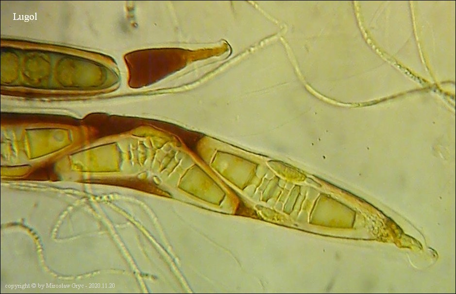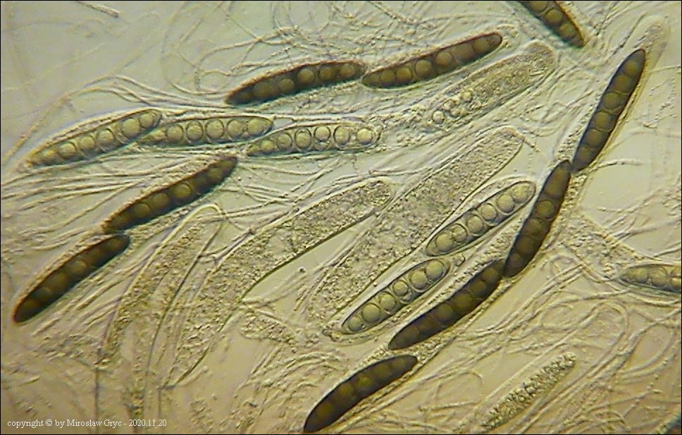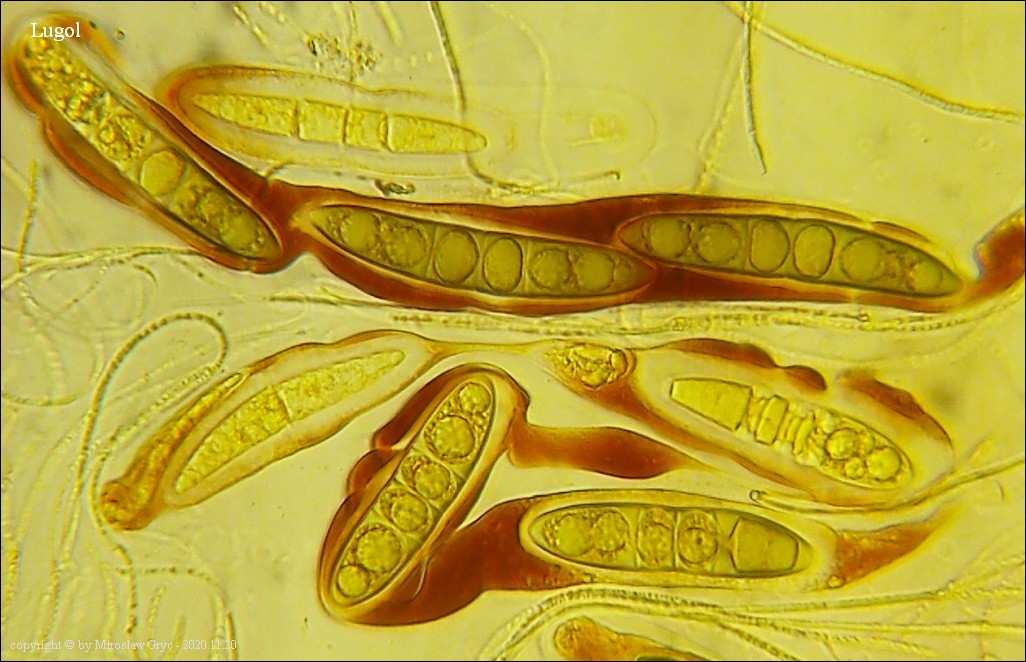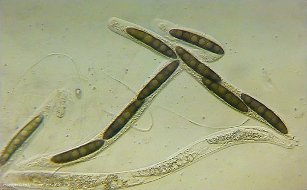 Substrat: Owocniki porastające martwe gałęzie czeremchy (Prunus padus) , na znacznej części owocników pasożytowała Flammocladiella decora . Serdeczne podziękowania uczestnikom forum AscoFrance za pomoc w identyfikacji!