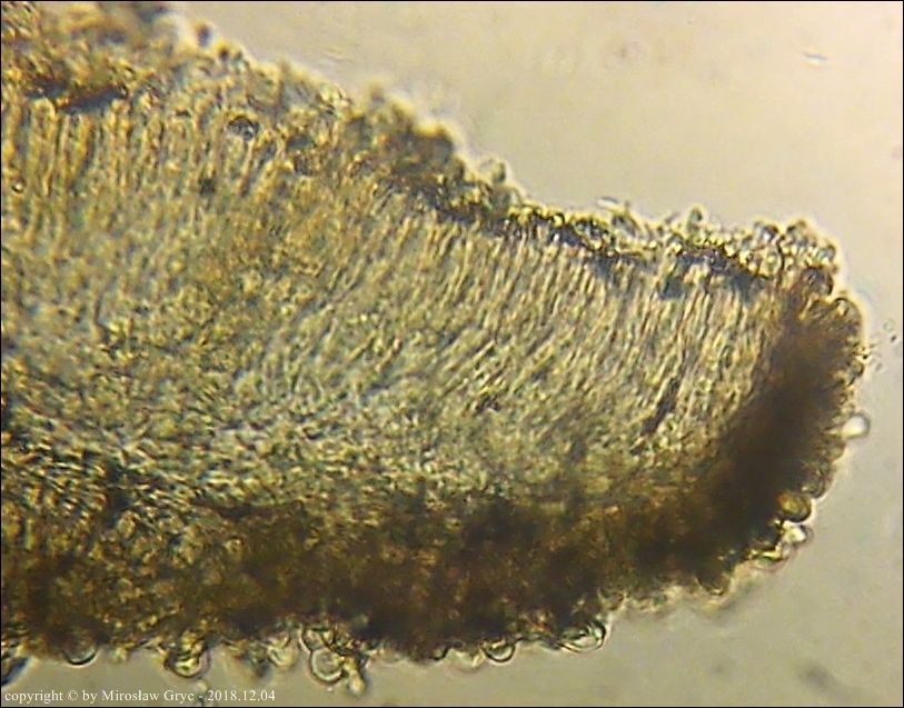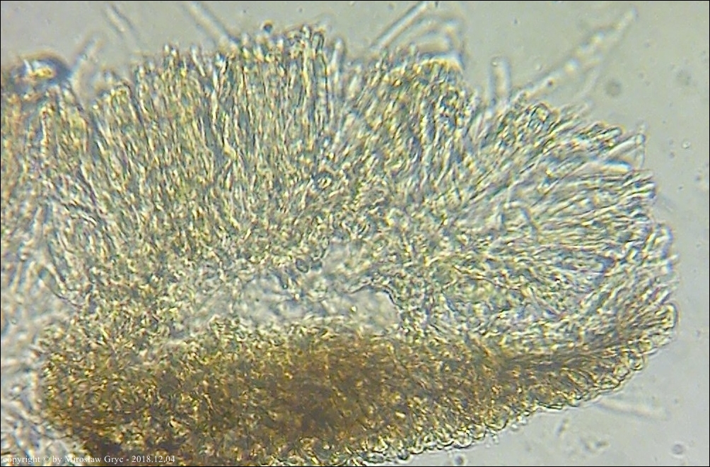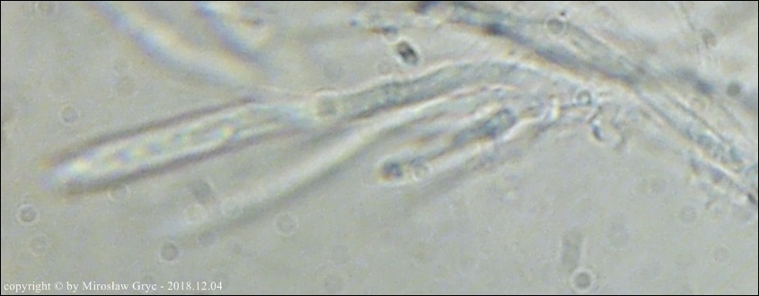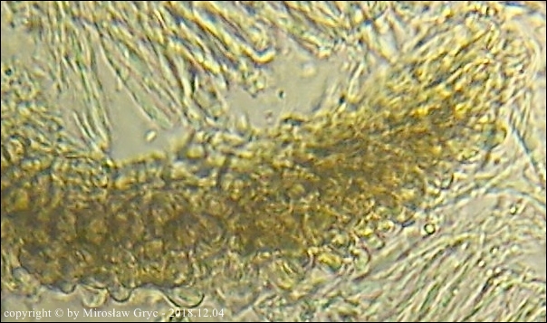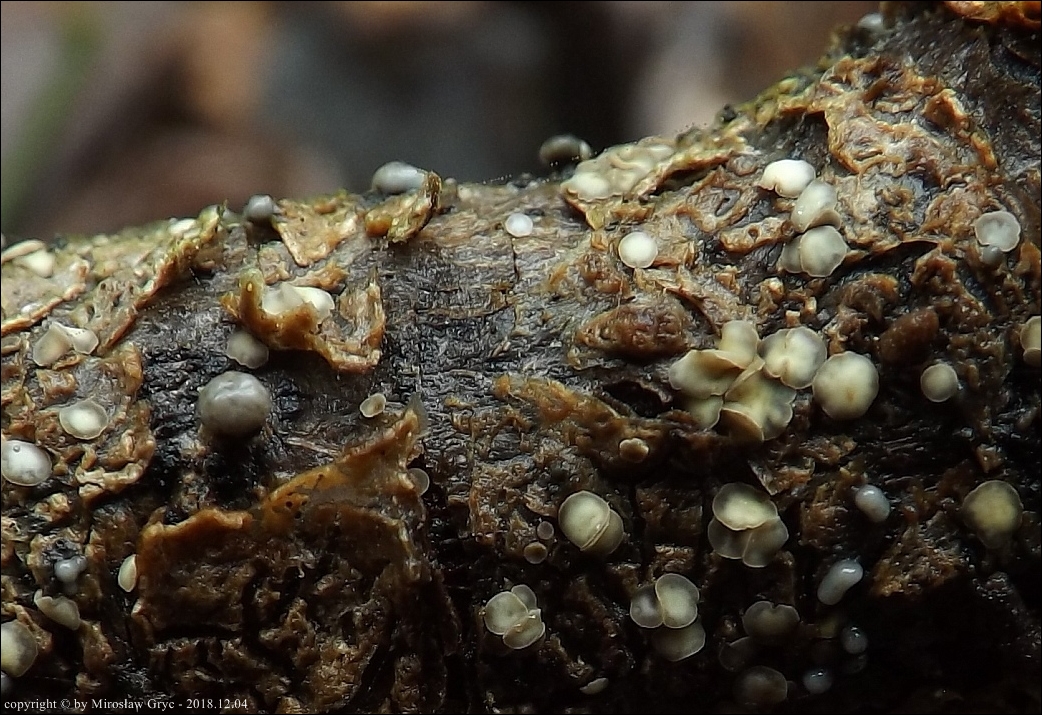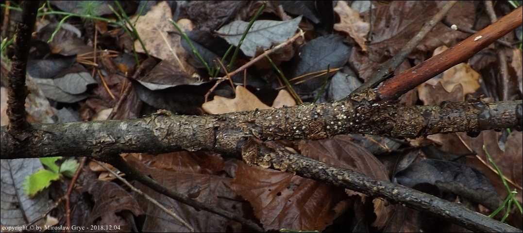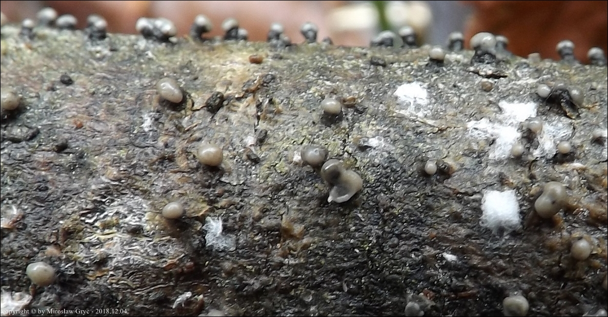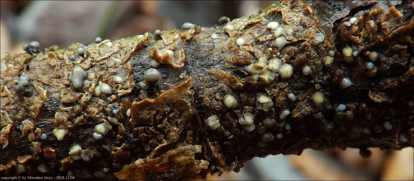 Substrat: Owocniki na martwej gałęzi wierzby, zawieszonej tuż nad ziemią.