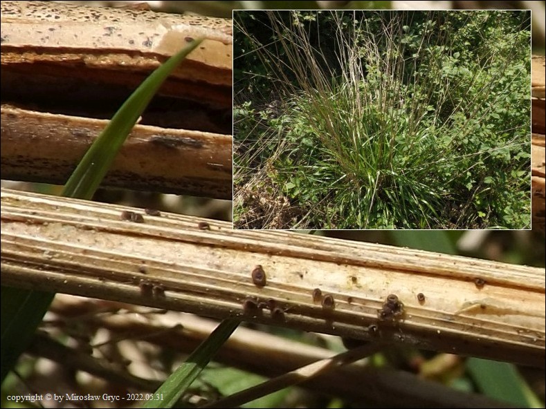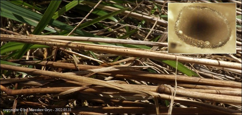 Substrat: Owocniki na ubiegłorocznych pędach trawy, rosnącej na skraju szkółki leśnej.