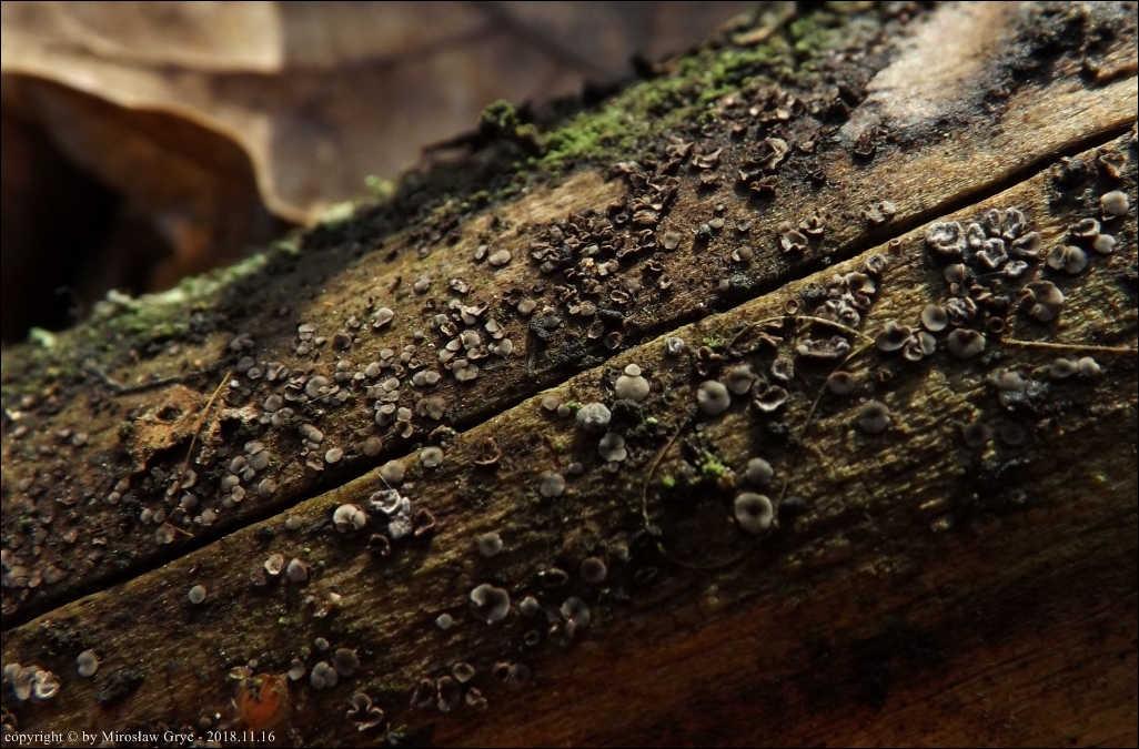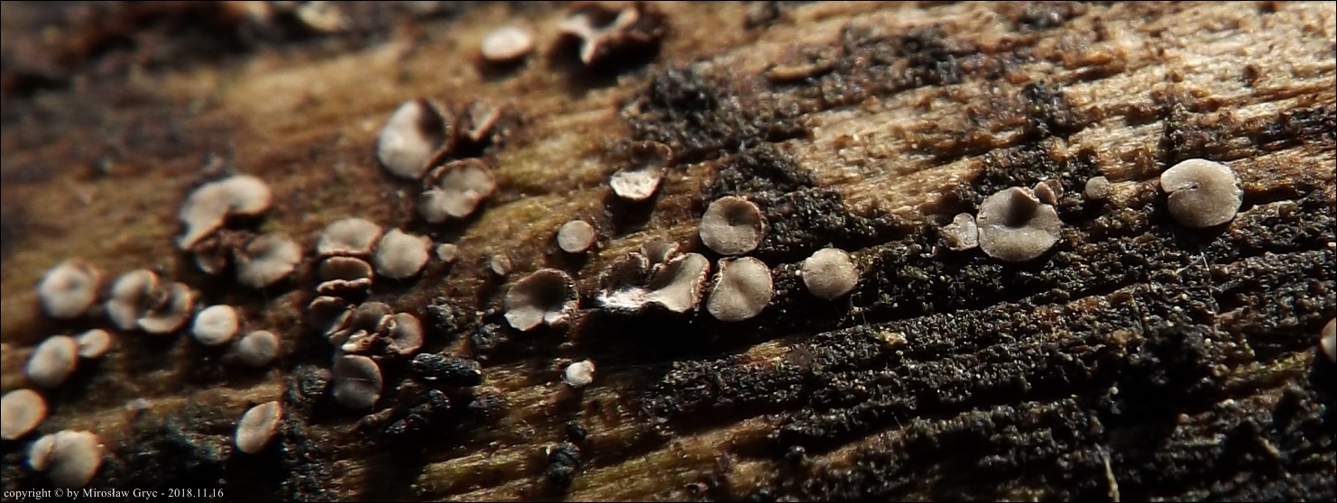 Substrat: Owocniki masowo na starej żerdzi świerkowej, dawniej służącej jako element ogrodzenia szkółki leśnej.