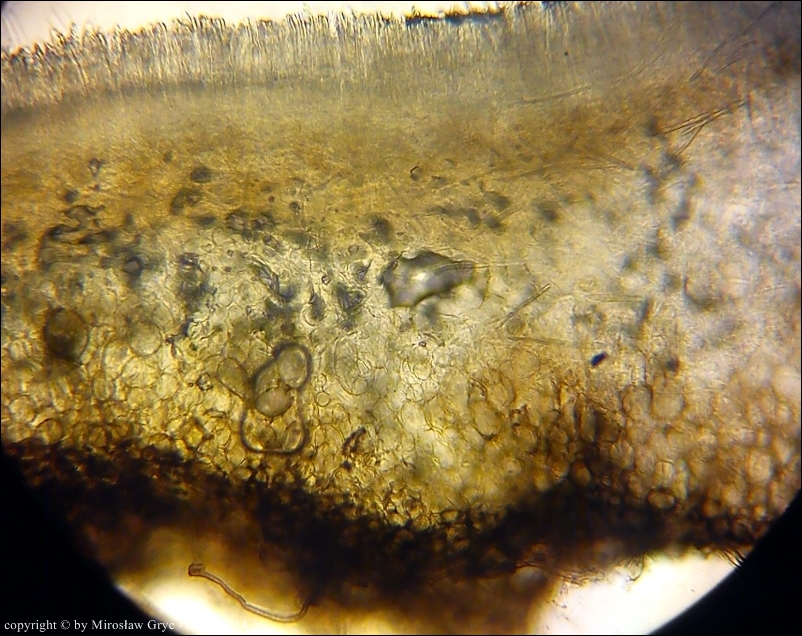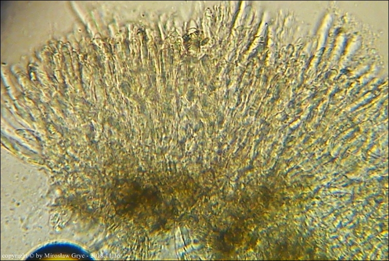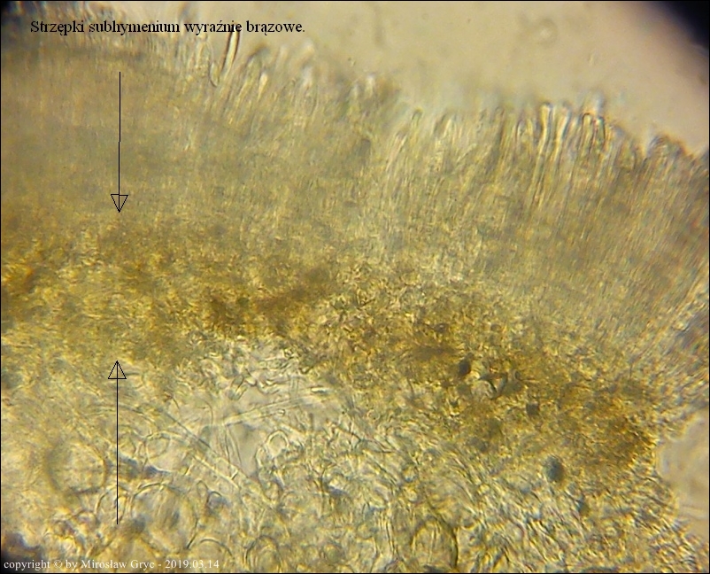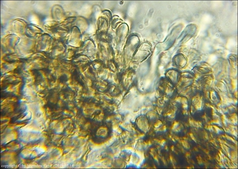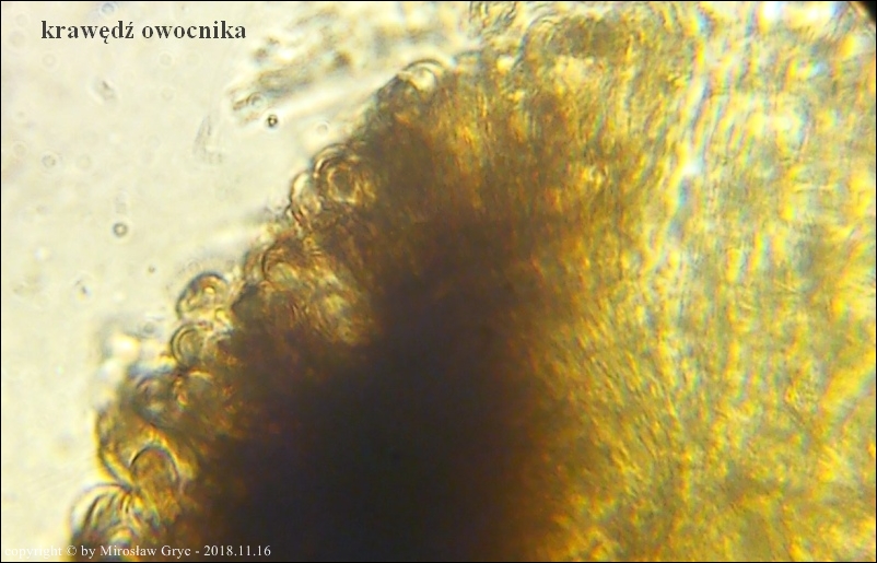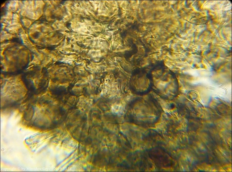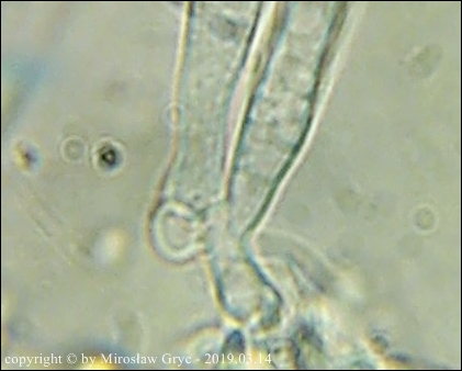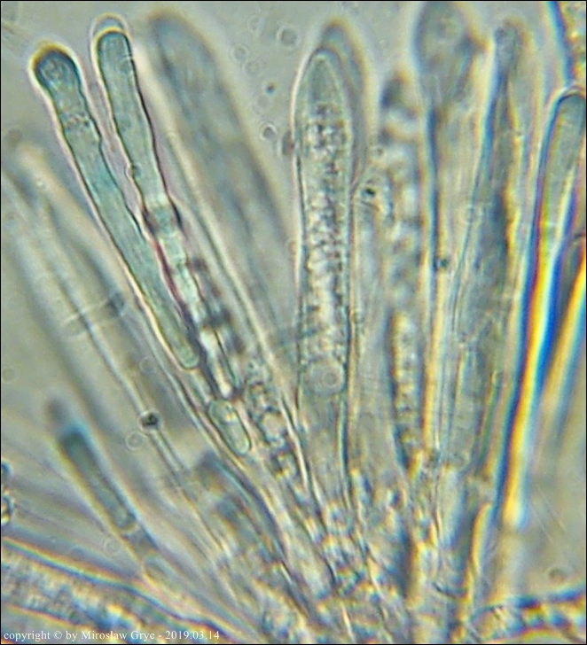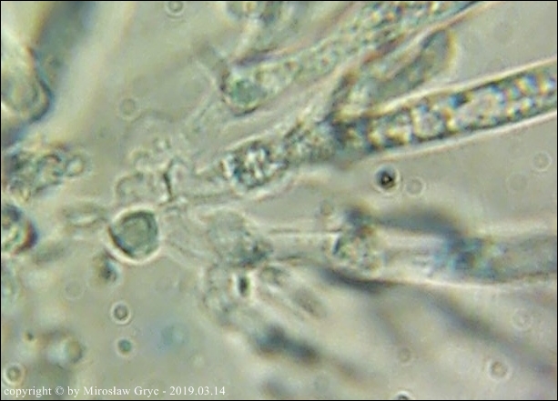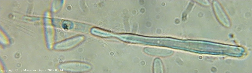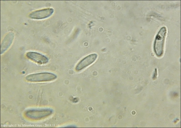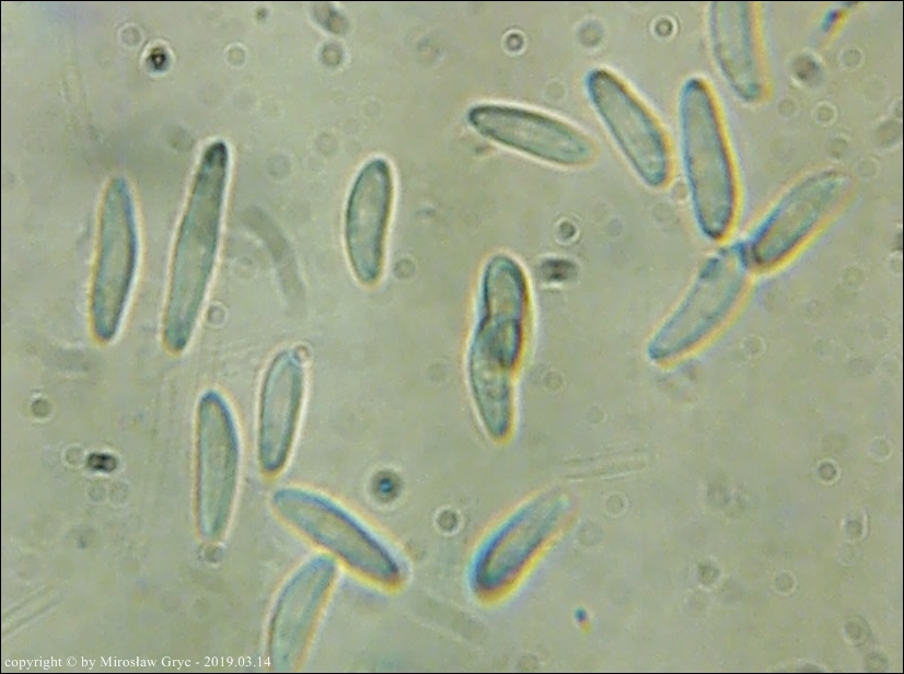 Zarodniki (6)8-13 x 2,5-3,3 µm, wewnątrz bez kropli.