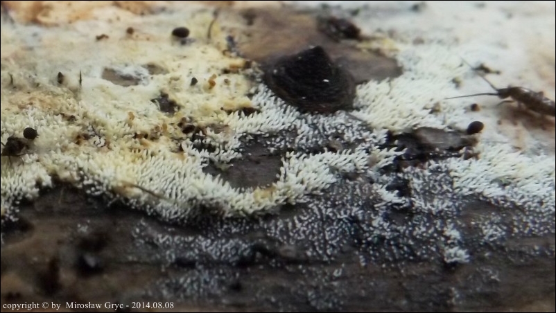 Substrat: Owocniki rosły na dolnej stronie, na pozostałych w lesie gałęziach ściętej sosny. Gatunek określił mikroskopowo Dariusz Karasiński.