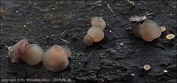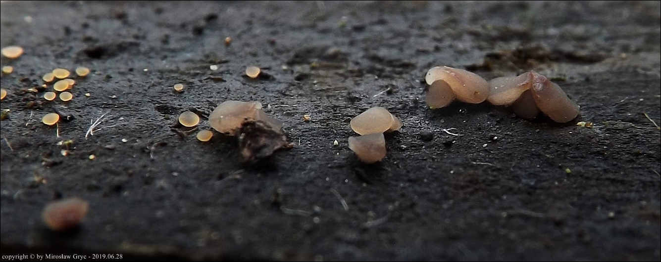 Substrat: Owocniki na kawałku drewna leżącego na błotnistej ziemi.