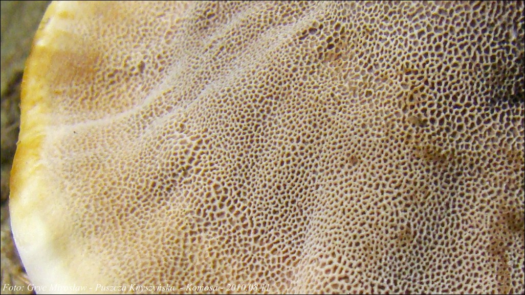 Hymenofor: porowaty, wyraźnie zbiegający po trzonie; pory barwy szarej do szarobrązowej, za młodu nieraz z fioletowawym odcieniem, w starszym wieku brunatne podobnie jak reszta owocnika, kształtu od okrągłego do kanciastego, wielkość zmienna, zazwyczaj mniejsze przy brzegu kapelusza i stopniowo powiększające się w kierunku trzonu.