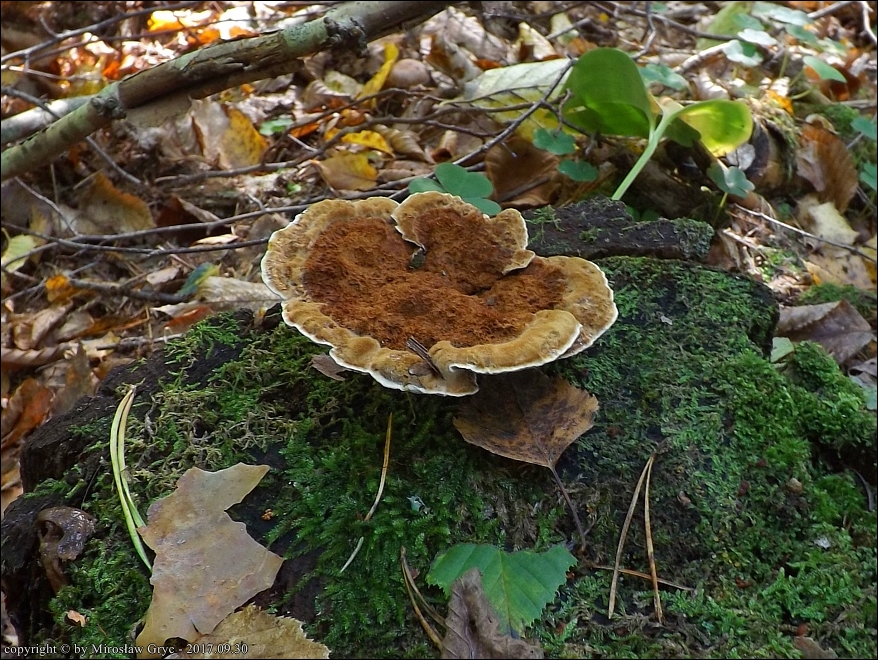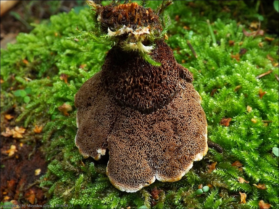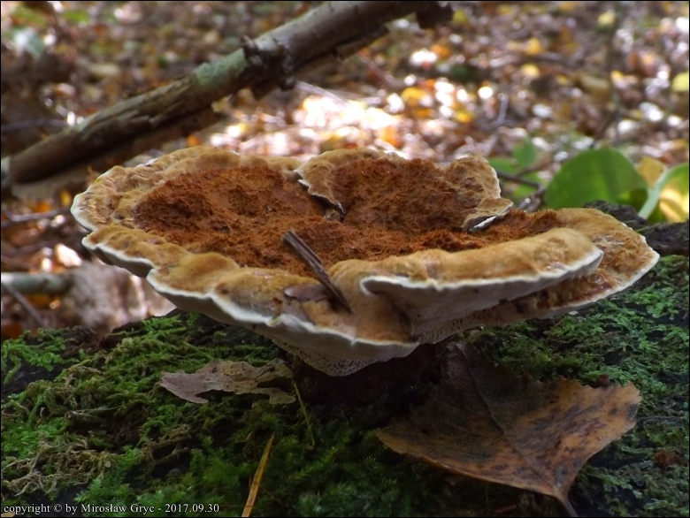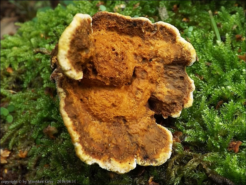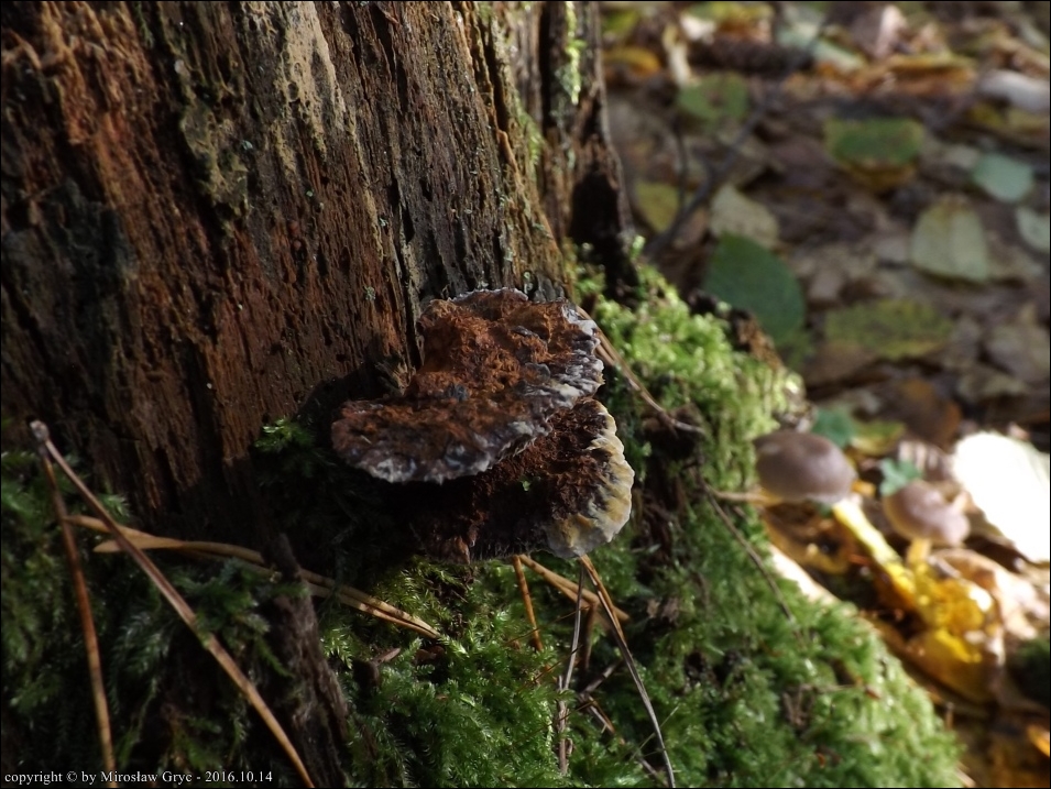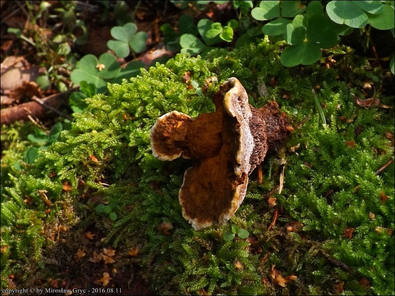 Substrat: Las mieszany ze zdecydowaną przewagą sosny. Jeden owocnik na butwiejącym sosnowym pniaku.