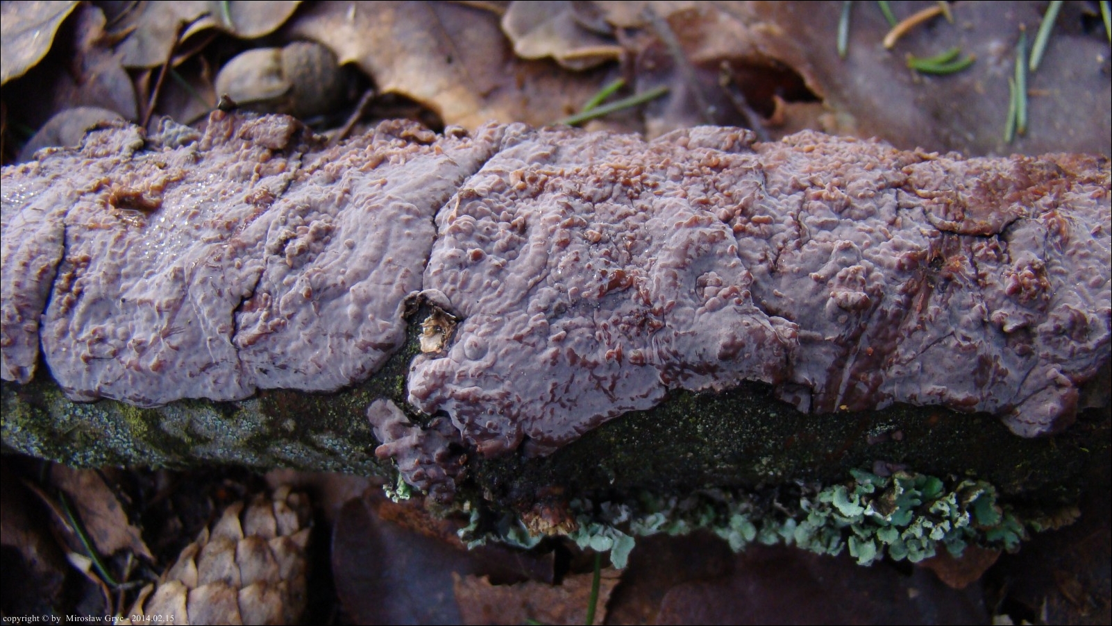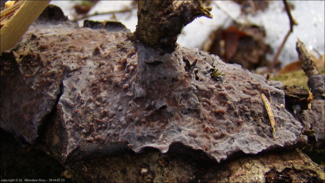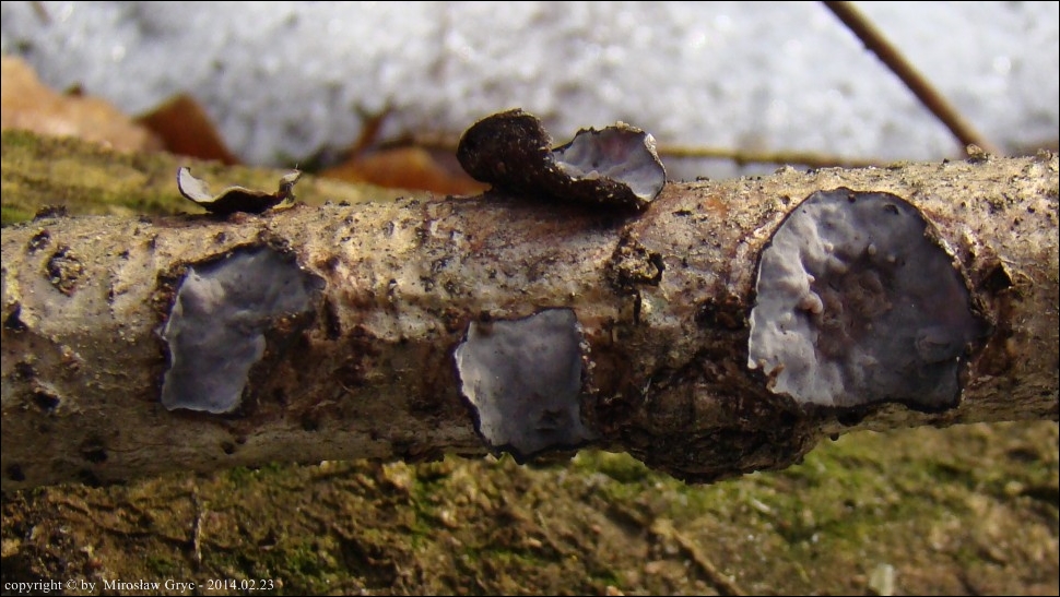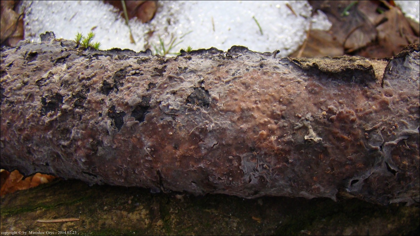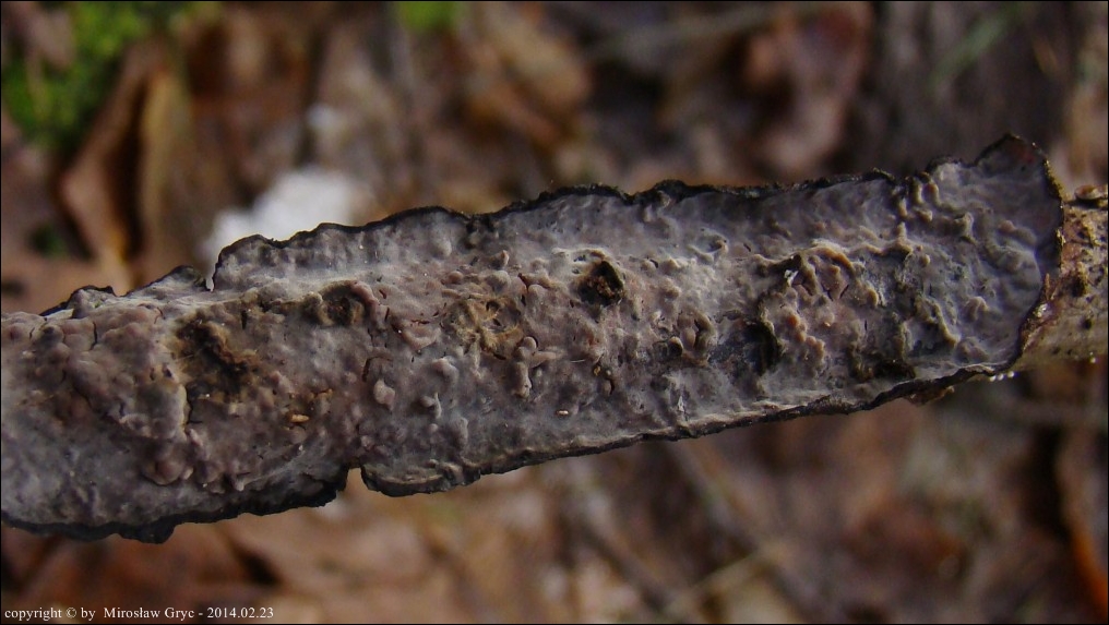 Lokalizacja: Zadrzewienie śródpolne w pobliżu Ogrodniczek, owocniki na cienkiej dębowej gałęzi leżącej na ziemi.