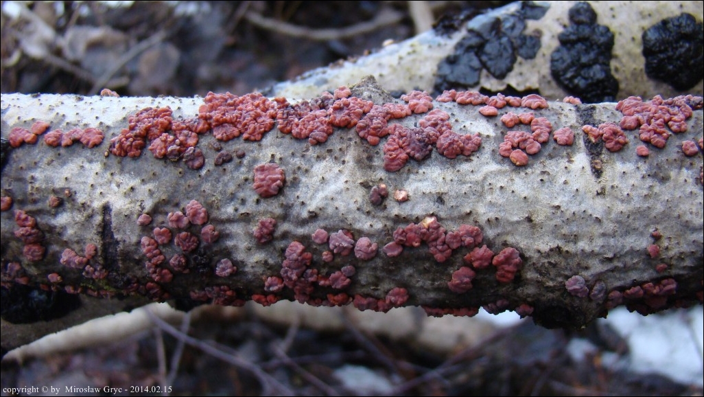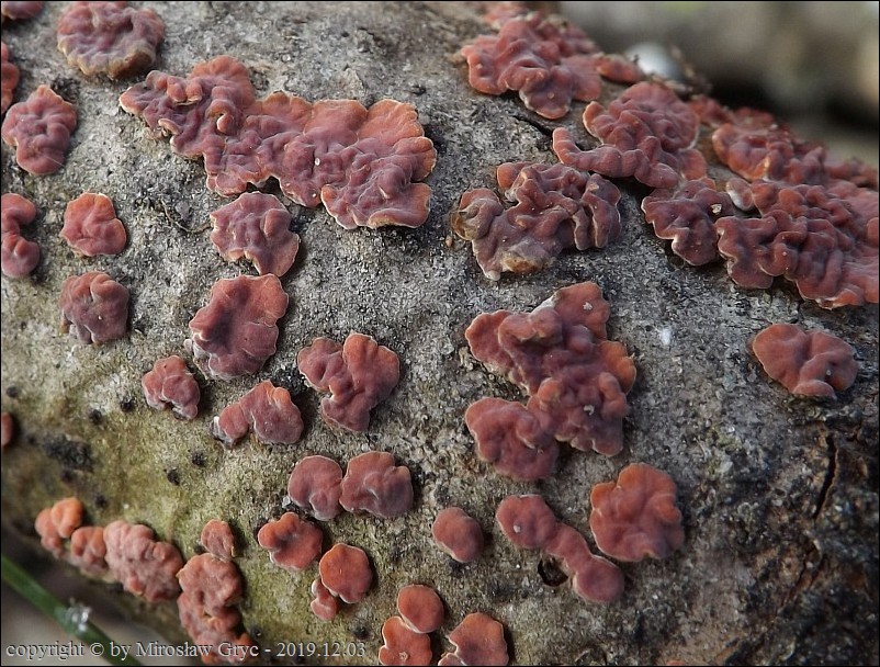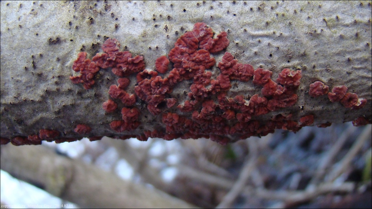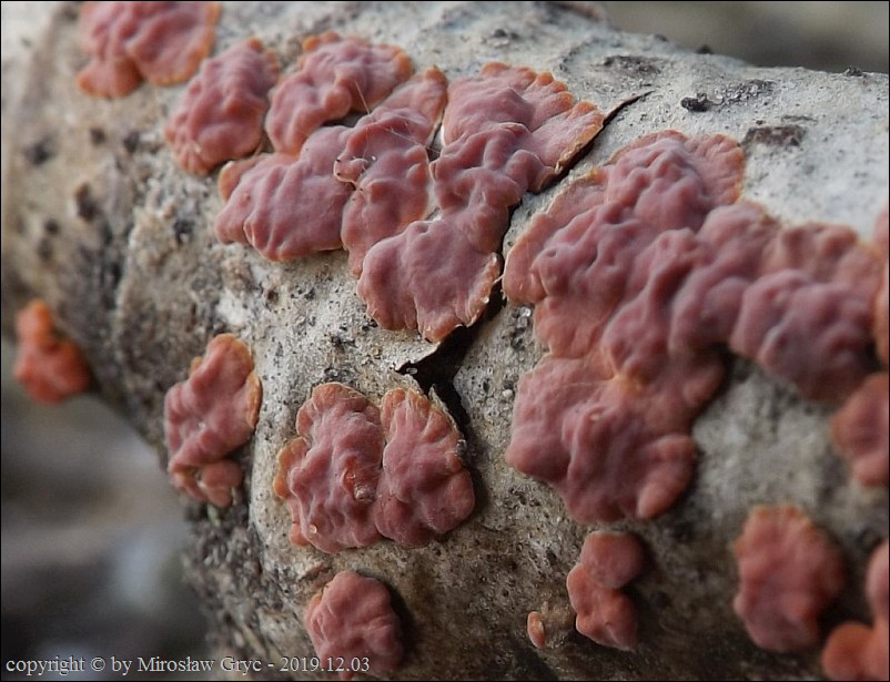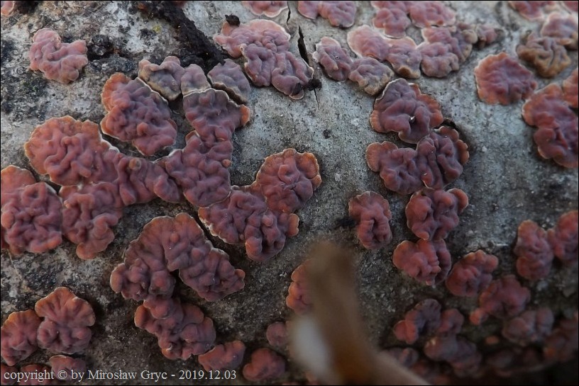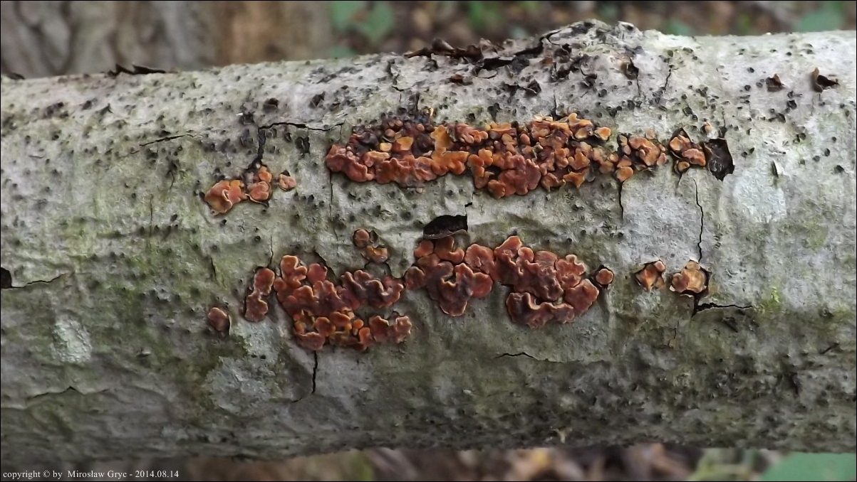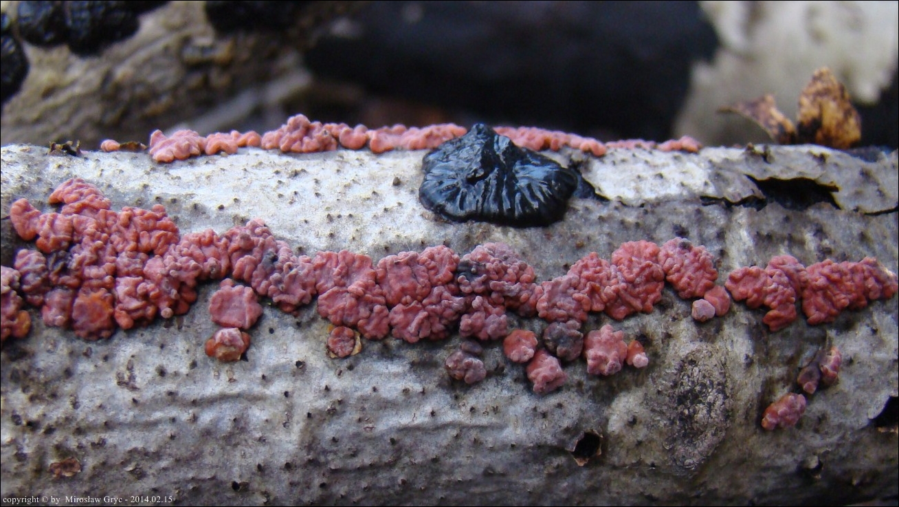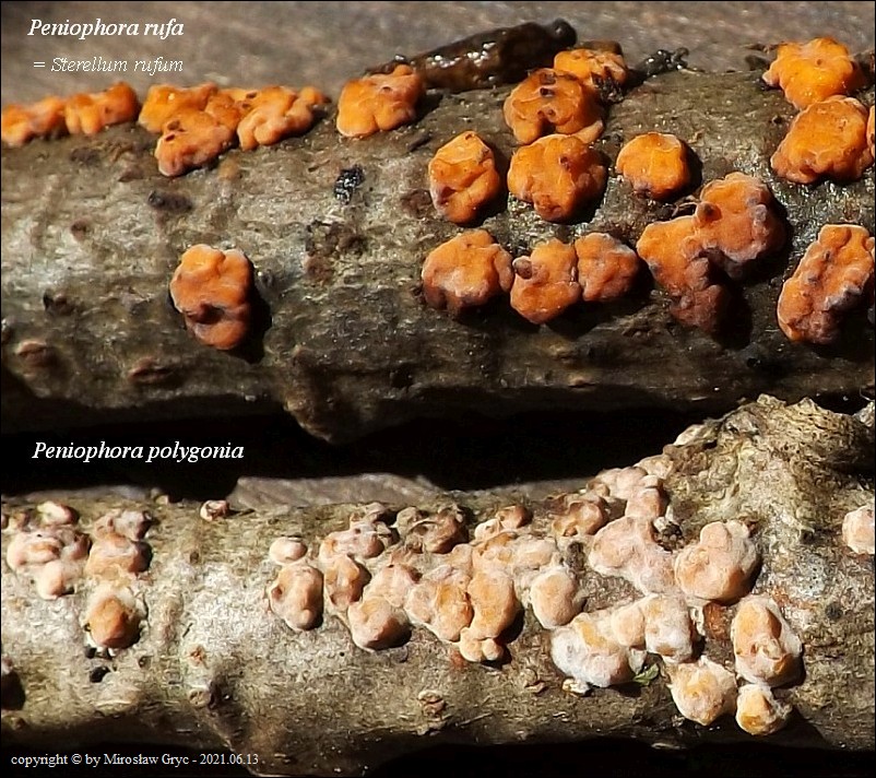 Dość częsty przypadek występowania obok siebie, na tym samym substracie dwóch gatunków: Peniophora rufa oraz Peniophora polygonia .