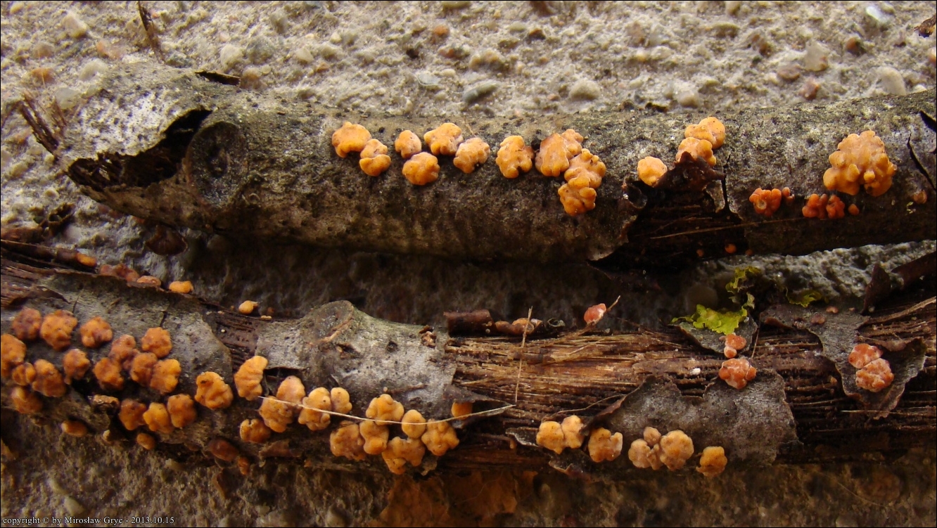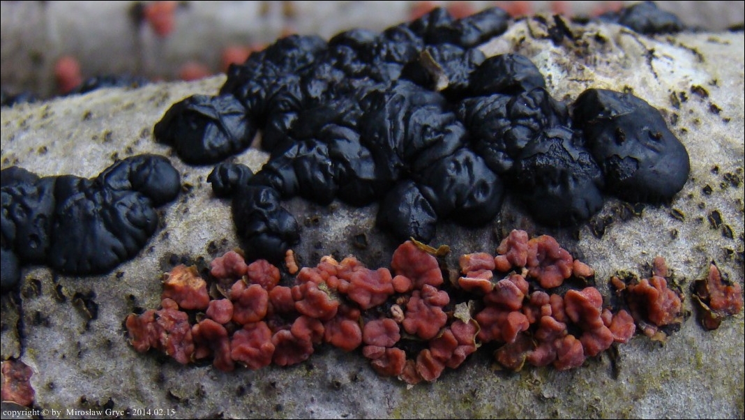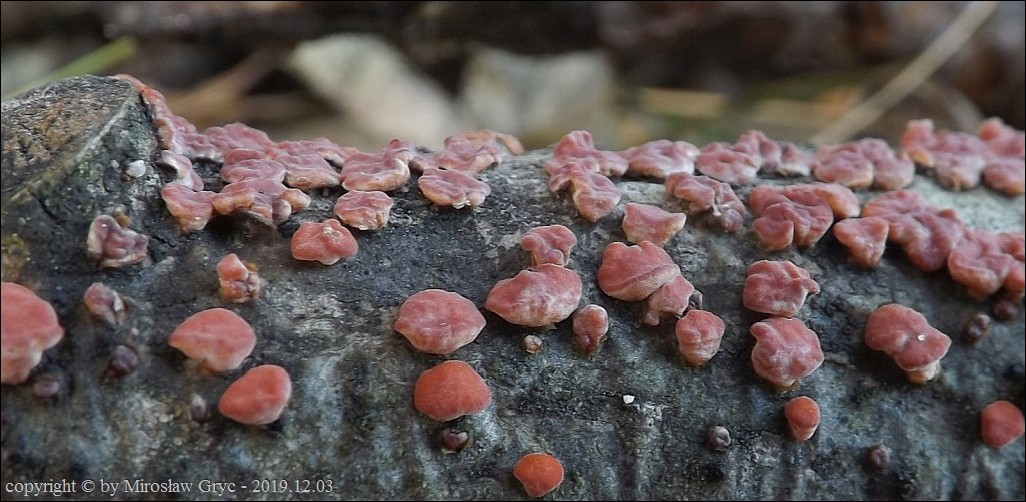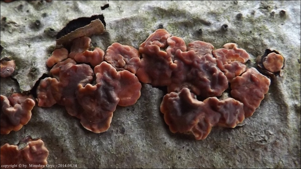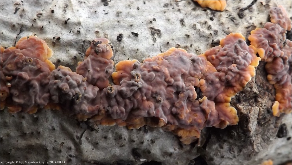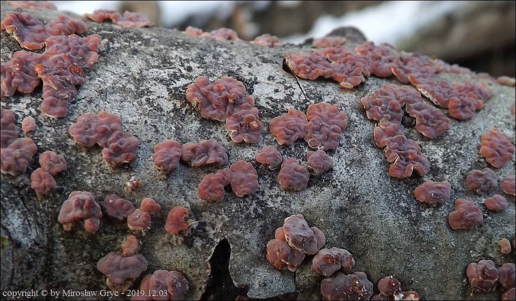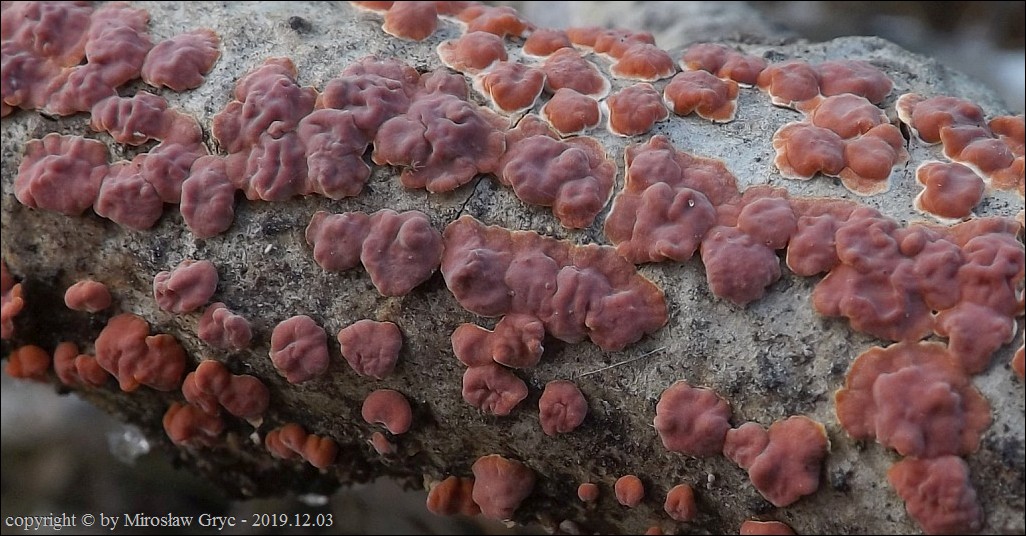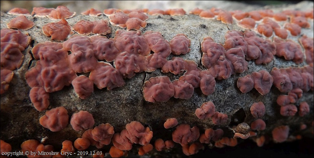 Dość częsty przypadek występowania obok siebie, na tym samym substracie dwóch gatunków: Peniophora rufa oraz Peniophora polygonia .