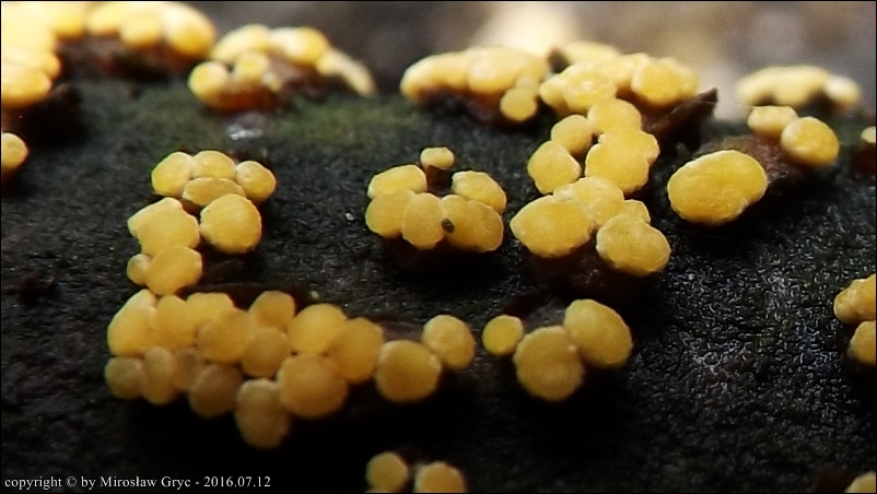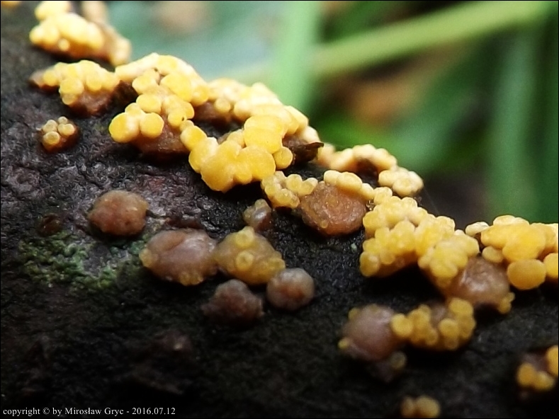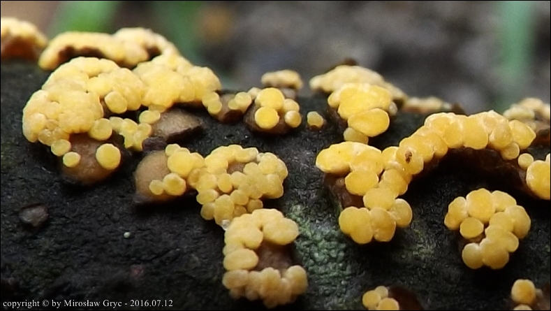 Substrat: Owocniki masowo na leżącej na ziemi gałęzi liściastego.