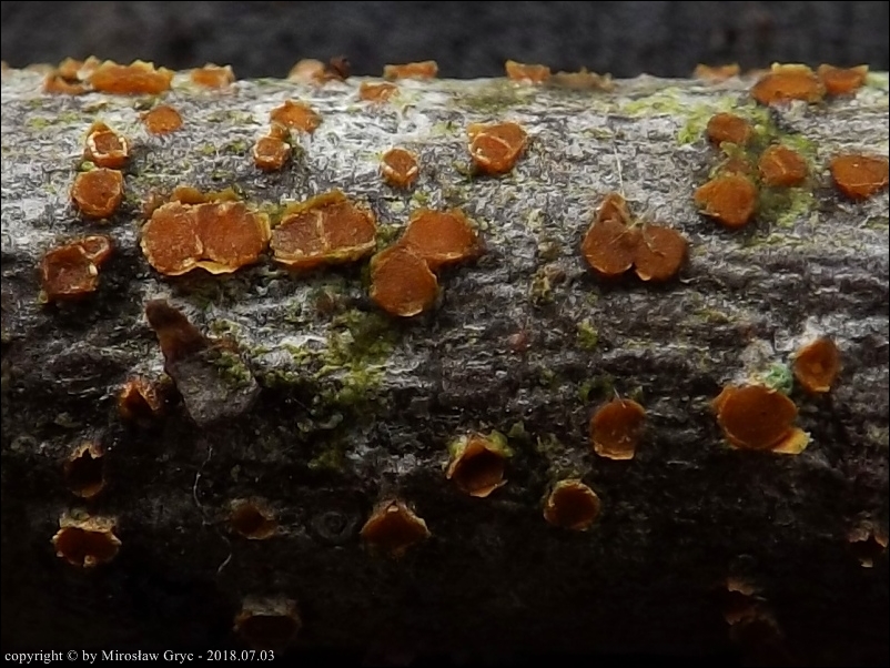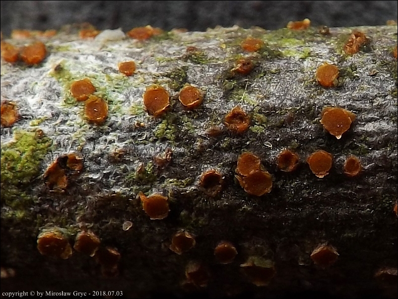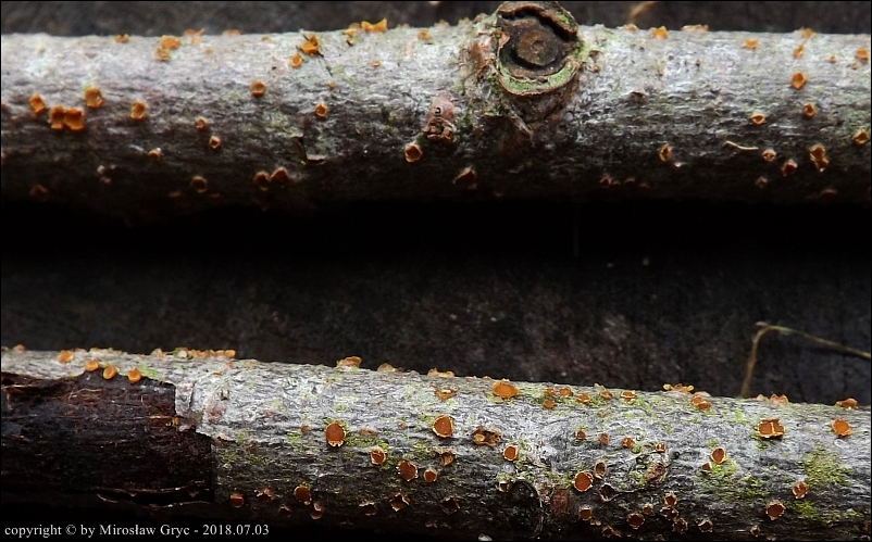 | 2016.05.15 | Owocniki masowo na martwych gałązkach wierzby. | Ogrodniczki, gm. Supraśl, prywatna posesja. Stanowisko zgłoszone do Krajowego Rejestru GREJ ID: 296422. |