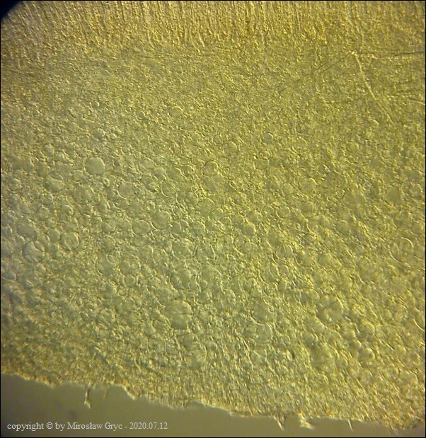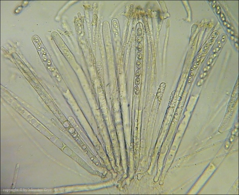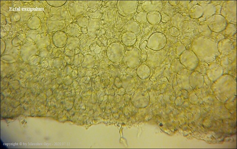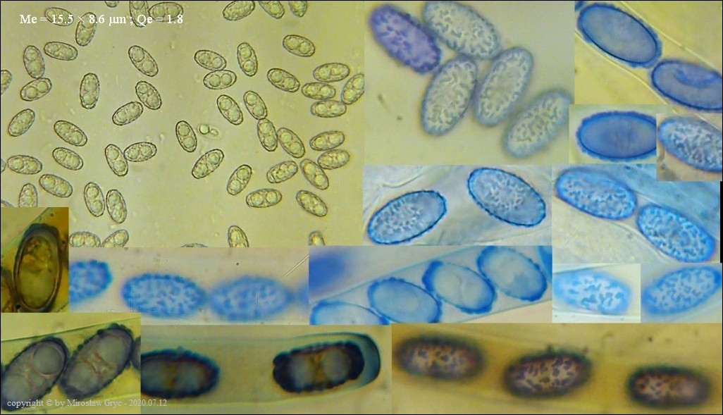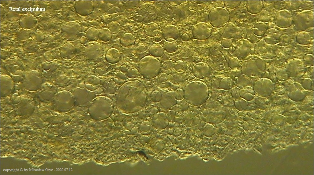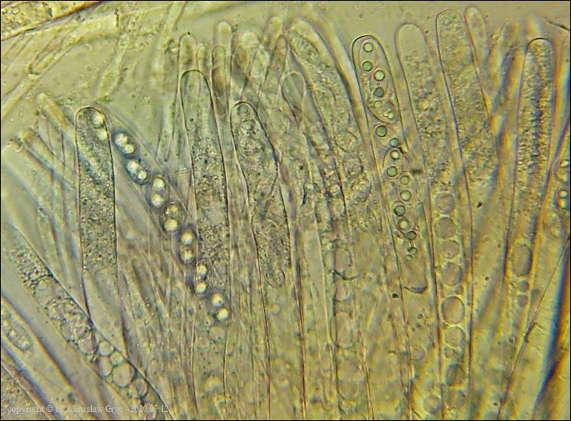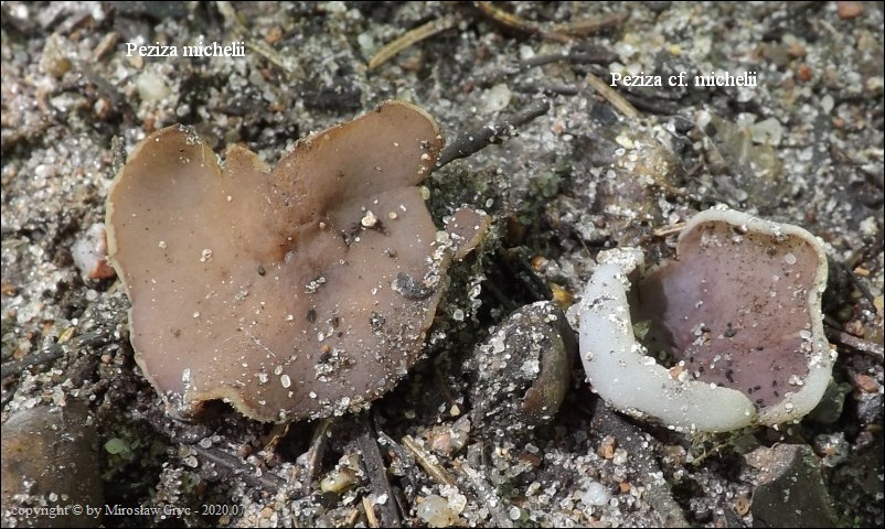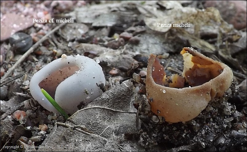 Bardzo ciekawa kolekcja która posiada zgodne prawie wszystkie cechy z P. michelii. Jedyną podstawową różnicą, którą widoczna jest "gołym okiem", to zabarwienie zewnętrznej powierzchni owocnika. To dawałoby podstawy do uznania tej kolekcji za jakąś formę albinistyczną. Zastanawiający jest jednak fakt występowania tuż obok, typowej P. michelii. Grupy te, pomimo, że wyrastały w bardzo bliskim sąsiedztwie to jednak nie były zmieszane między sobą. Brakowoło również między nimi form pośrednich, co z kolei skłaniałoby do uznania tej kolekcji za odrębny gatunek. Cechy mikroskopowe, zgodne w obu przypadkach, zadecydowały jednak o uznaniu jej za Peziza cf. michelii. Badanie owocników wykazało jeszcze jedną małą różnicę a mianowicie, charakter ornamentacji. W powyższej kolekcji w porównaniu do P. michelii, występował większy odsetek zarodników ze zgrubiałą ornamentacja na biegunach. Podobne zgrubienia spotykałem również u typowych P. michelii ale zdecydowanie u mniejszej ilości zarodników i nie tak wyraźne. Poza tym w tej kolekcji nie stwierdziłem występowania dojrzałych zarodników o złocistej barwie, które to często są spotykane u P. michelii. Być może to skutek dość młodego wieku owocników.Praktycznie wszystkie cechy pokazane są na zdjęciach więc dodać jedynie mogę: