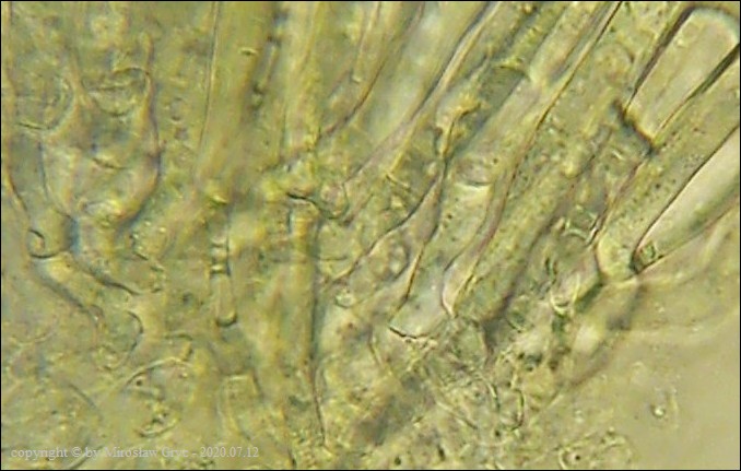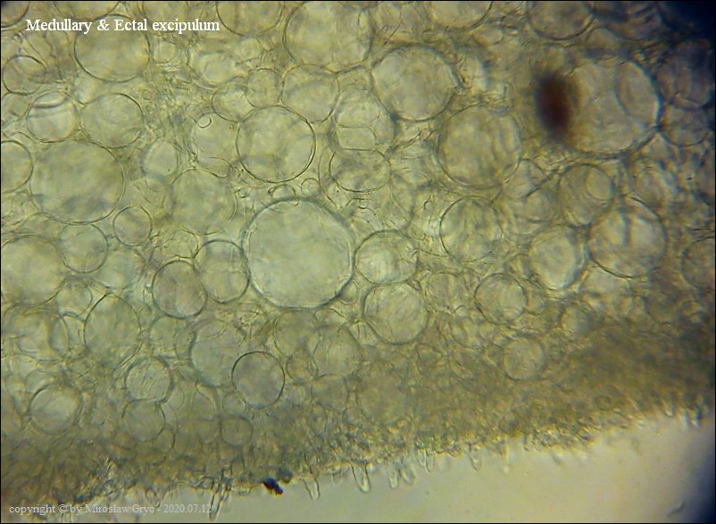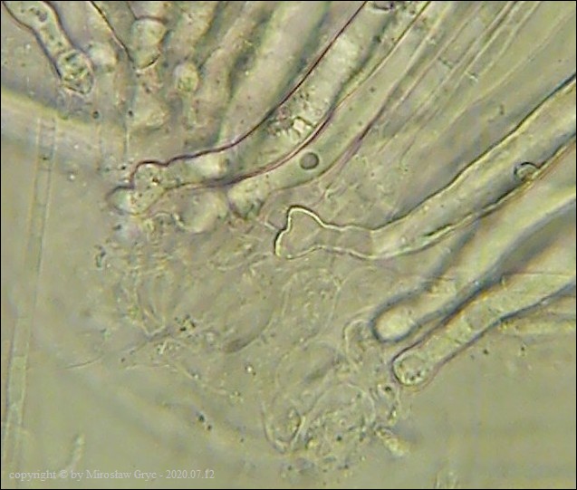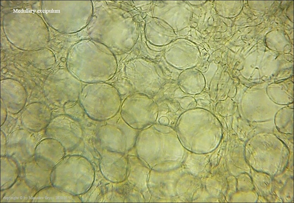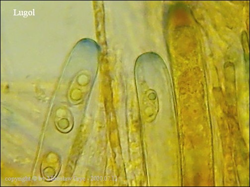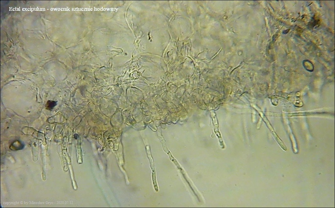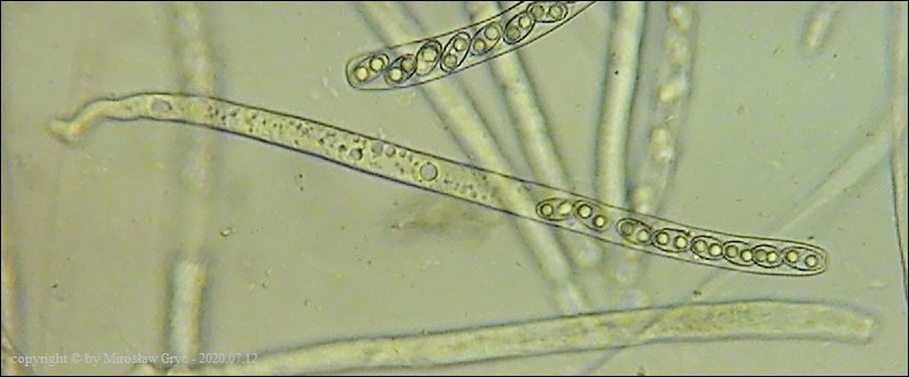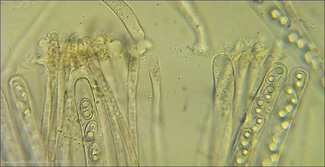 Bardzo ciekawa kolekcja która posiada zgodne prawie wszystkie cechy z P. michelii. Jedyną podstawową różnicą, którą widoczna jest "gołym okiem", to zabarwienie zewnętrznej powierzchni owocnika. To dawałoby podstawy do uznania tej kolekcji za jakąś formę albinistyczną. Zastanawiający jest jednak fakt występowania tuż obok, typowej P. michelii. Grupy te, pomimo, że wyrastały w bardzo bliskim sąsiedztwie to jednak nie były zmieszane między sobą. Brakowoło również między nimi form pośrednich, co z kolei skłaniałoby do uznania tej kolekcji za odrębny gatunek. Cechy mikroskopowe, zgodne w obu przypadkach, zadecydowały jednak o uznaniu jej za Peziza cf. michelii. Badanie owocników wykazało jeszcze jedną małą różnicę a mianowicie, charakter ornamentacji. W powyższej kolekcji w porównaniu do P. michelii, występował większy odsetek zarodników ze zgrubiałą ornamentacja na biegunach. Podobne zgrubienia spotykałem również u typowych P. michelii ale zdecydowanie u mniejszej ilości zarodników i nie tak wyraźne. Poza tym w tej kolekcji nie stwierdziłem występowania dojrzałych zarodników o złocistej barwie, które to często są spotykane u P. michelii. Być może to skutek dość młodego wieku owocników.Praktycznie wszystkie cechy pokazane są na zdjęciach więc dodać jedynie mogę:
