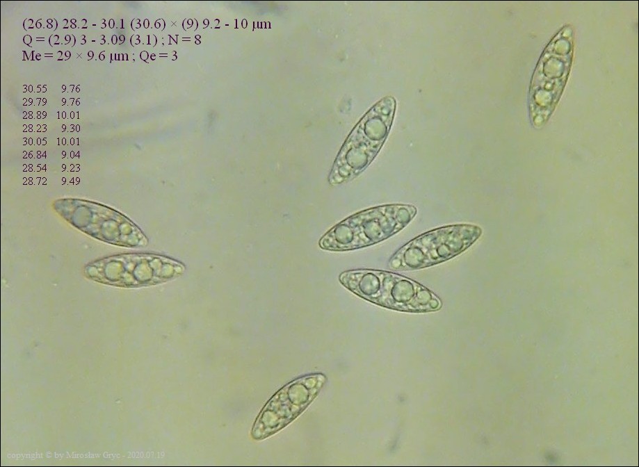 Zarodniki (fot. 04) o wymiarach: 28.25-31.43 x 8.24-9.09 µm.