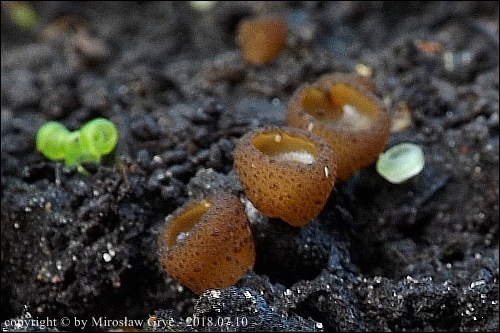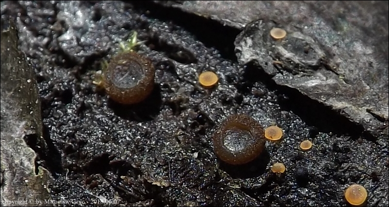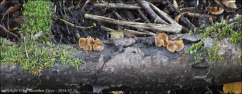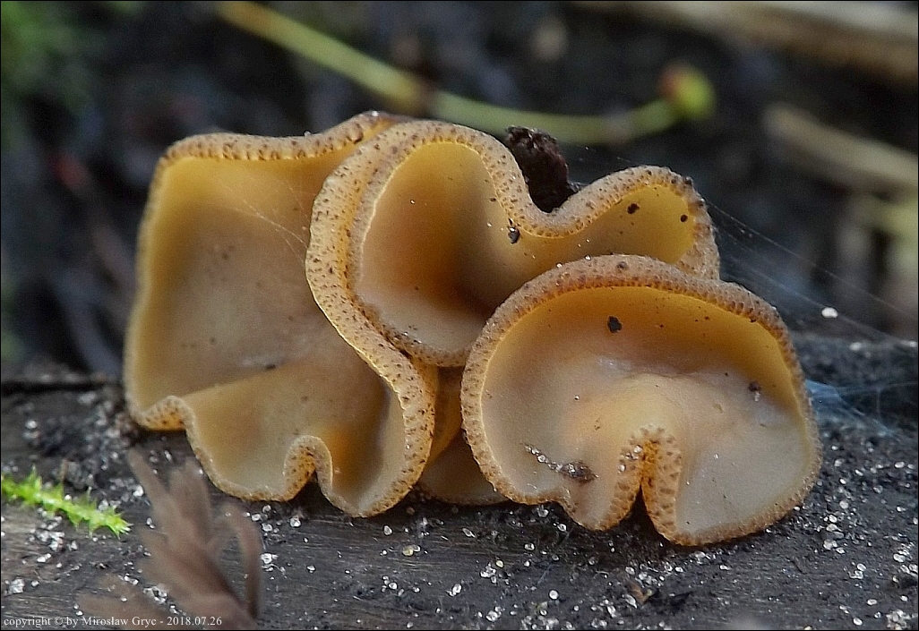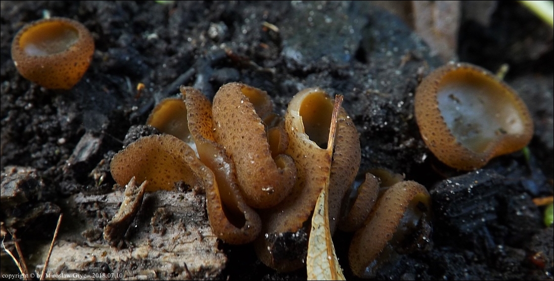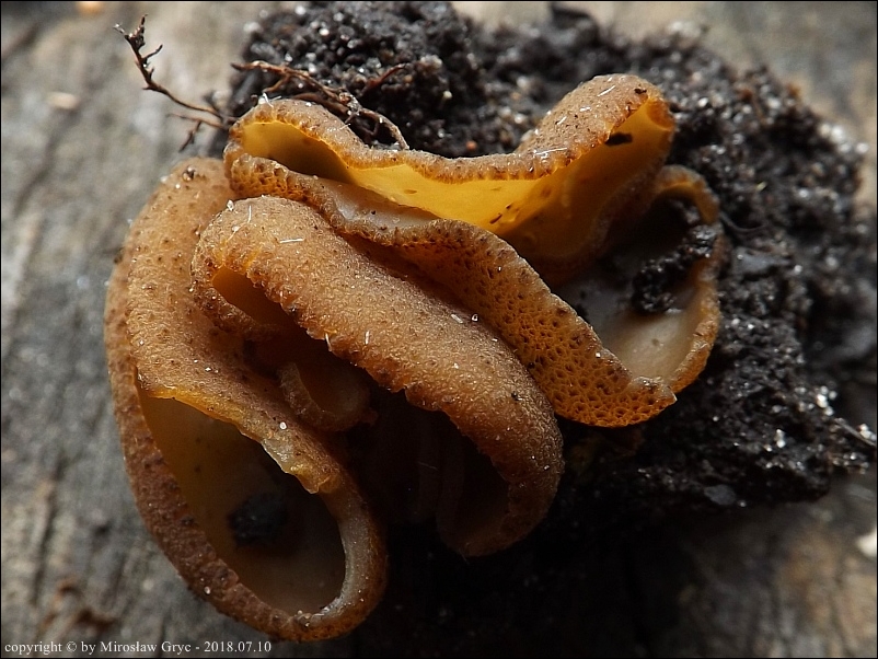 Owocniki maksymalnie średnicą do około 15 mm. Wyrastały na próchnicznej, wilgotnej (błotnistej) glebie oraz na mocno zbutwiałych szczątkach drewna.