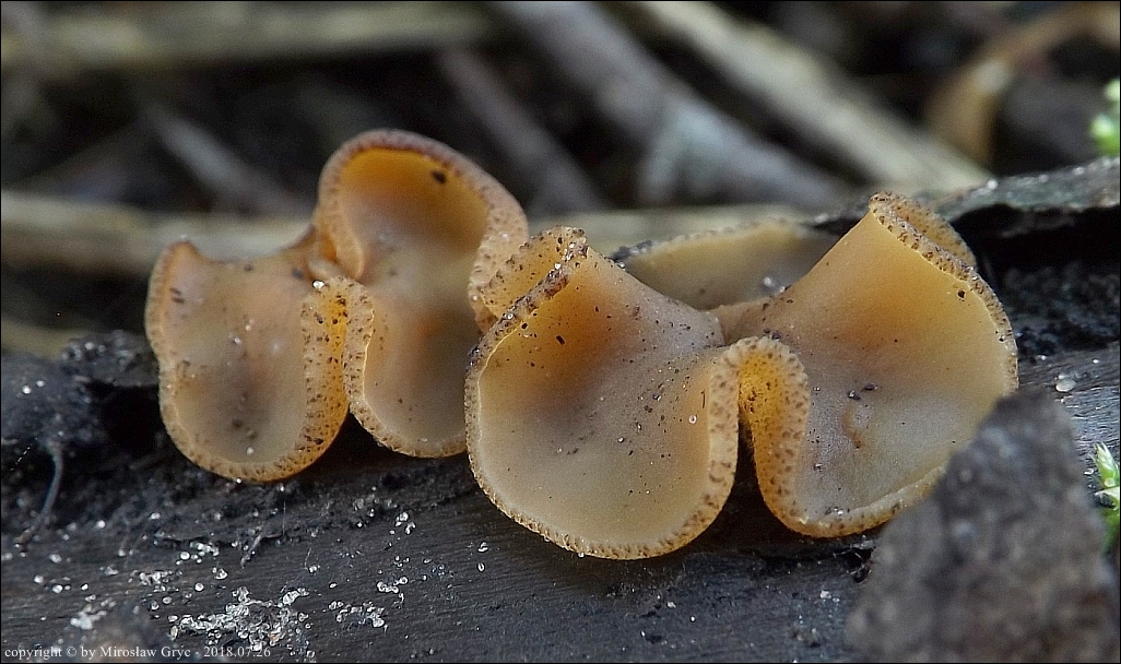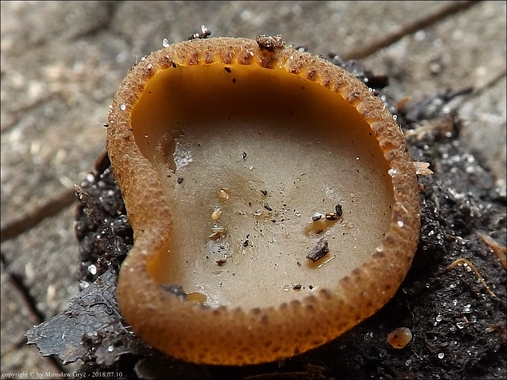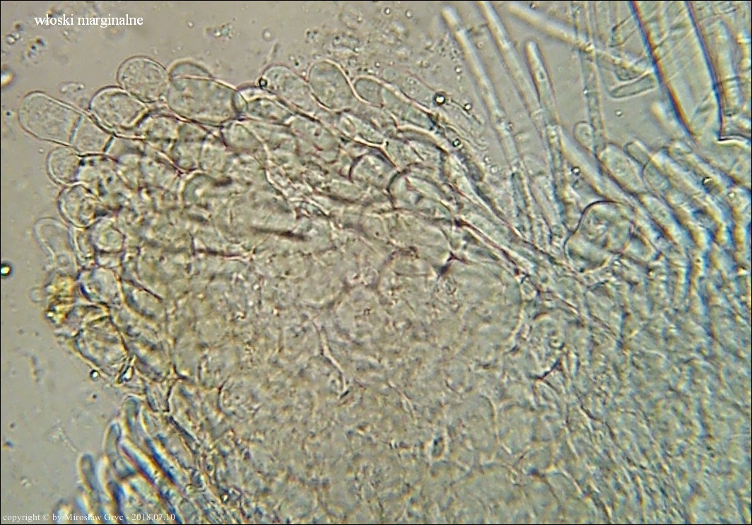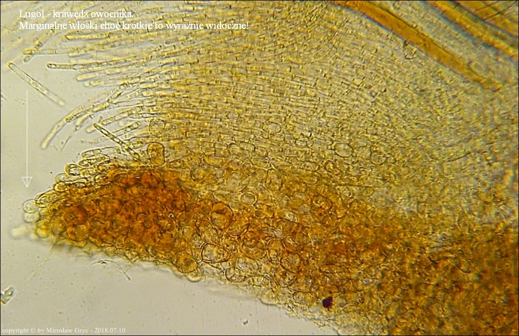 Ciekawość moją przykuwa jednak skraj owocnika. Na jego marginesie występuje szereg strzępek, wyglądem przypominających włoski (fot. 05 -08). Jak do tej pory u innych przedstawicieli rodzaju Peziza takich nie widziałem. Również w literaturze nie spotkałem się z opisem takiej cechy. Jedynie o czymś takim wspomina autor dość "świeżej" publikacji, opisując P. simplex. Do tej jednak zupełnie nie pasują cechy makro mego znaleziska. Być może ten detal był pomijany?