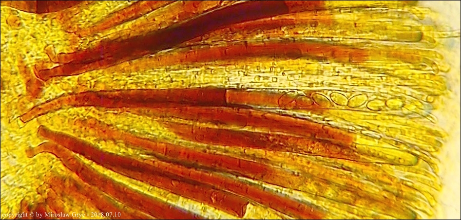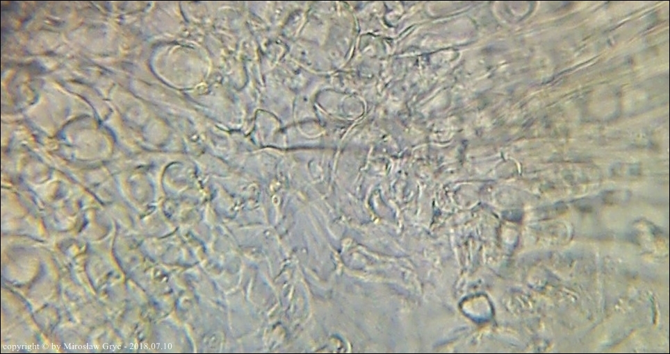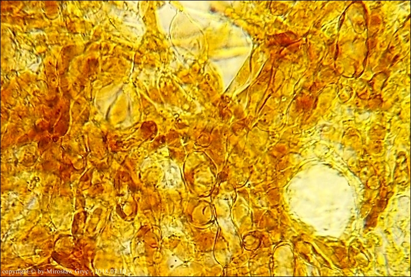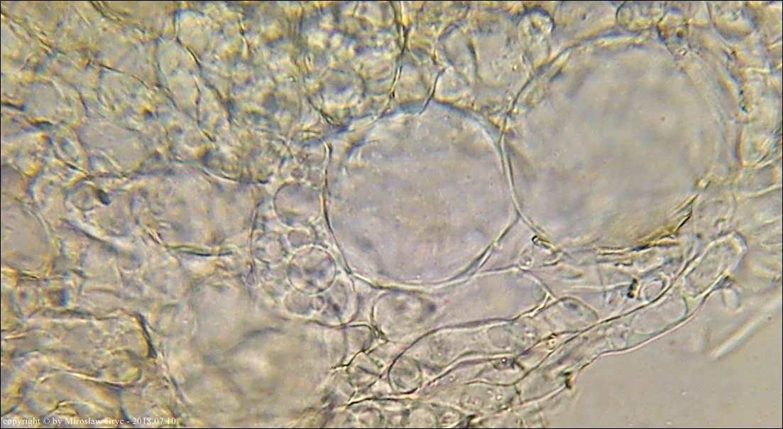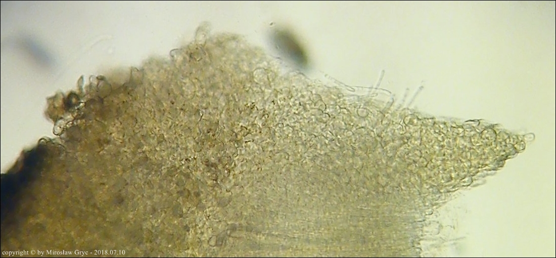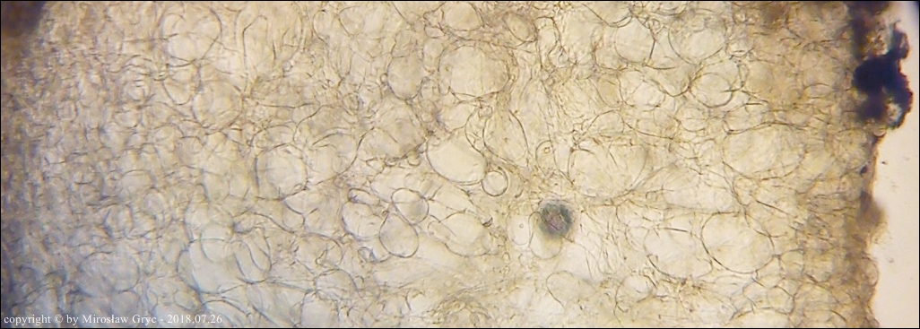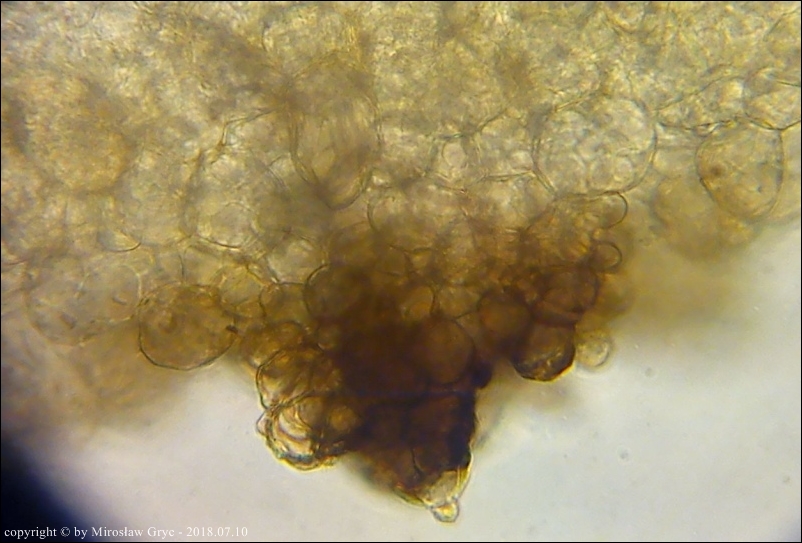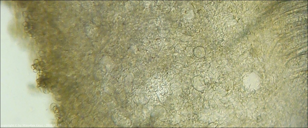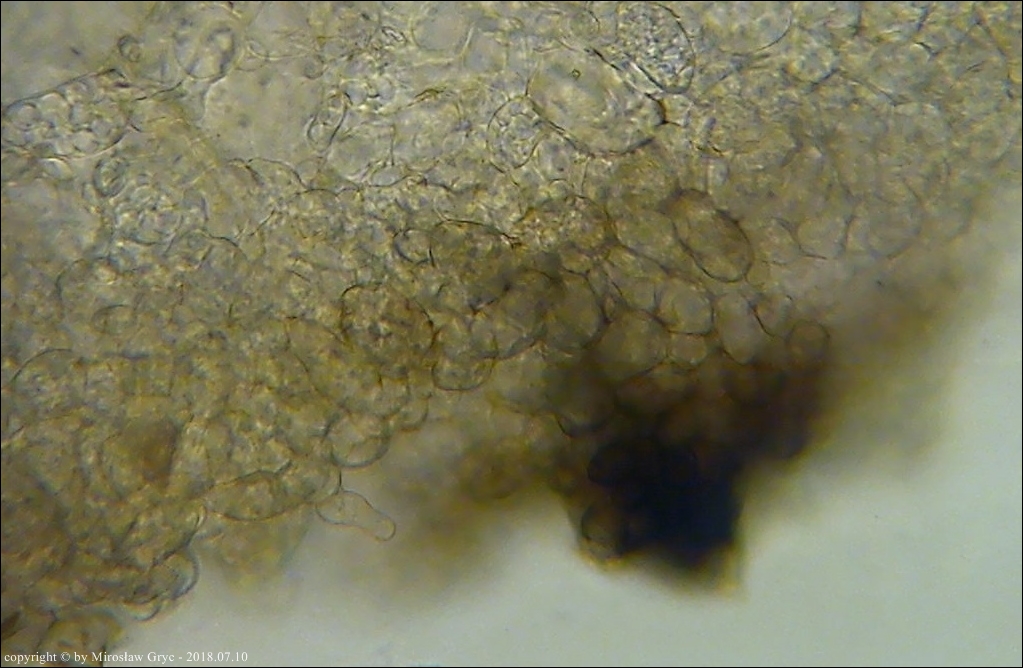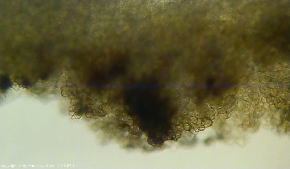 Tekstura warstwy środkowej (medullary excipulum) bez warstw, jednak zbudowana ze strzępek bardzo zróżnicowanych/zmiksowanych (fot. 09; 30; 31). Warstwa zewnetrzna (ectal excipulum) zbudowana już z bardziej jednorodnych elementów owalnych o mniejszej średnicy i zabarwionych na brązowo. Na zewnetrznej powierzchni owocnika występowały dość pokaźnych rozmiarów, ciemno zabarwione brodawki zbudowane z małej średnicy kulistych elementów.