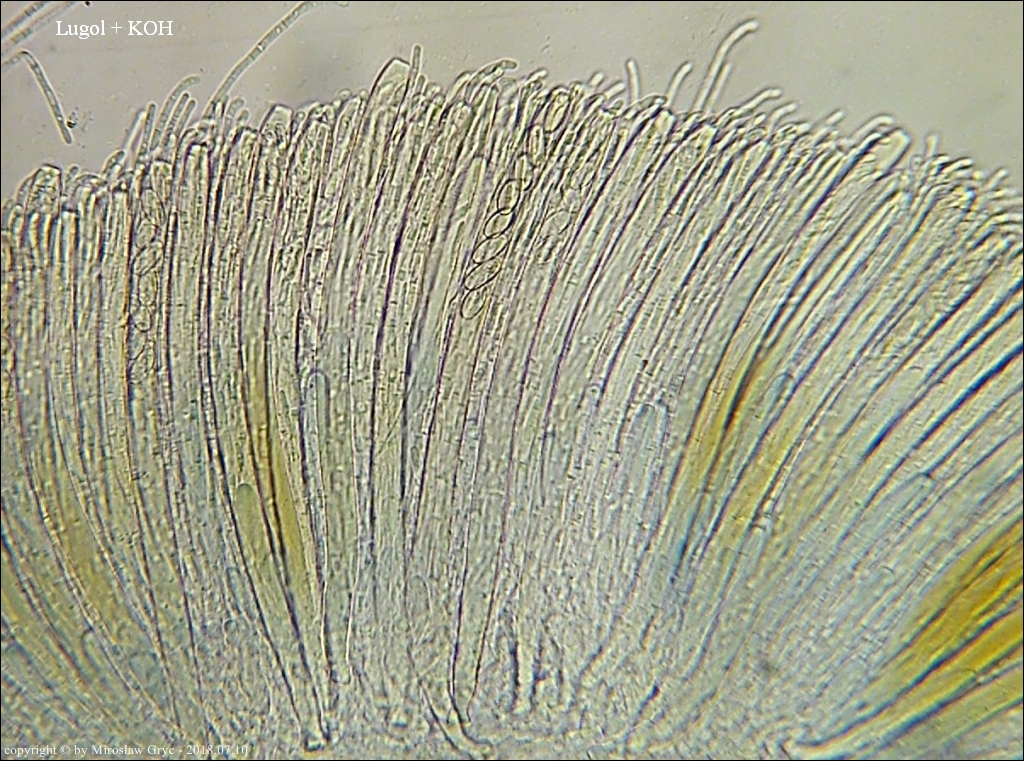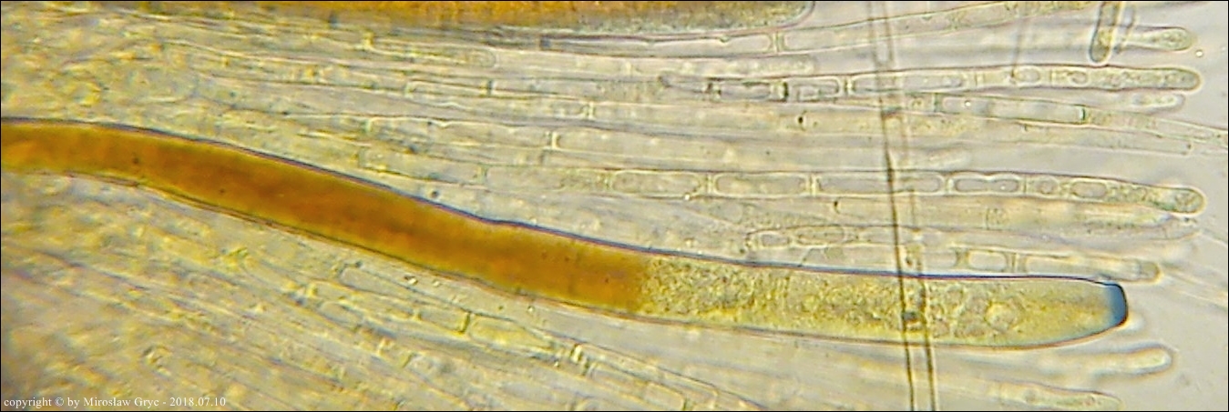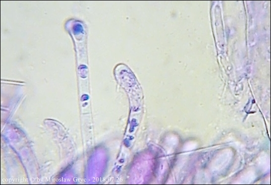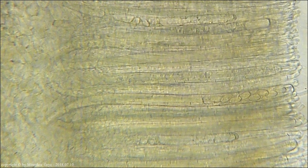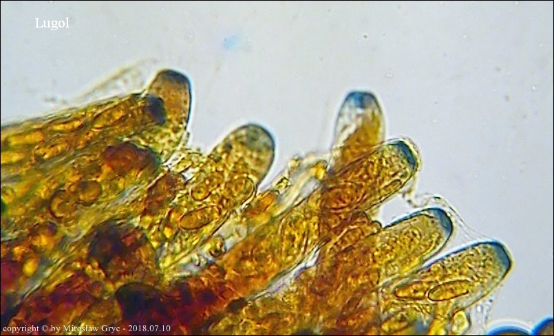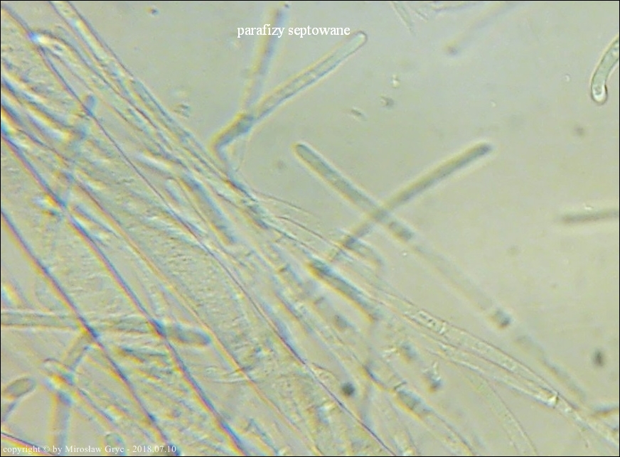 Parafizy septowane, z zakrzywionym i poszerzonym górnym członem. W nim też można zaobserwować hialinowe krople.