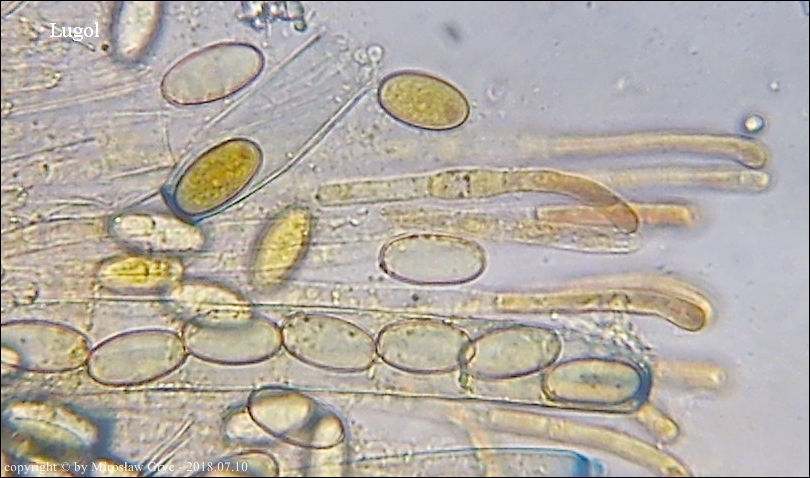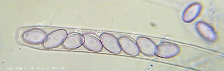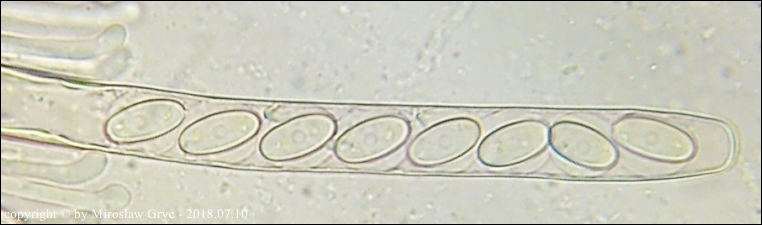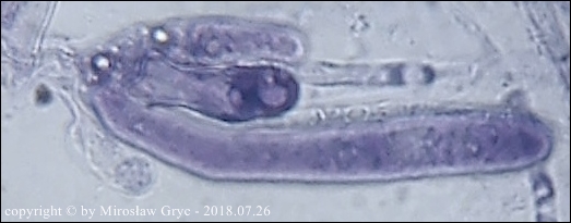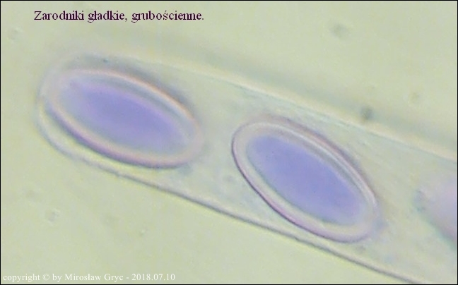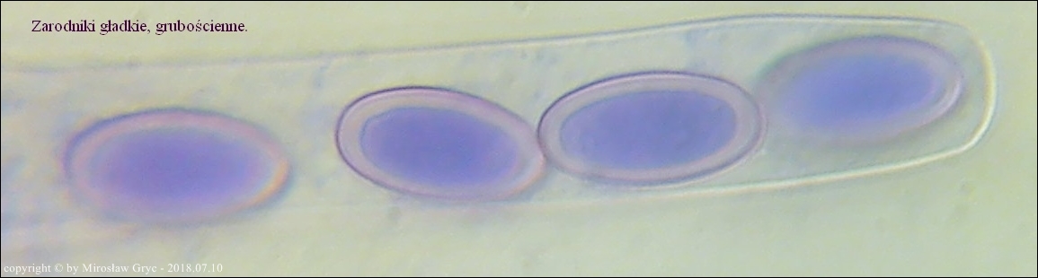 Zarodniki gładkie, chociaż nie wiem czy miałem okazję oglądać "dobrze" dojrzałe. Część owocników trzymałem nawet w "dojrzewalni" aż praktycznie do osiągnięcia momentu krytycznego. Owocniki pobierałem w dwóch terminach i za pierwszym razem były ewidentnie mało dojrzałe. Warto zwrócić uwagę na znaczną grubość ścianki zarodników niedojrzałych (fot. 25 - 26). Zarodniki (młode) w workach zazwyczaj były otoczone jakby osłonką z cytoplazmy (fot. 35 - 36).