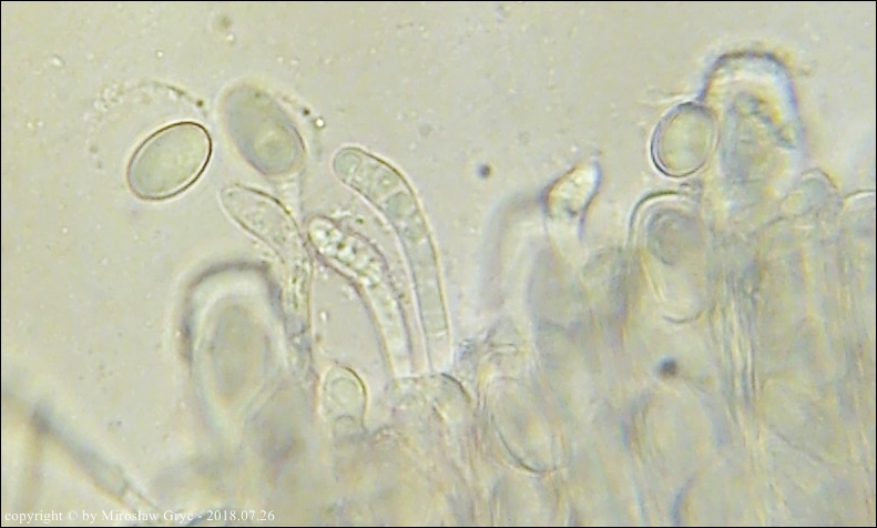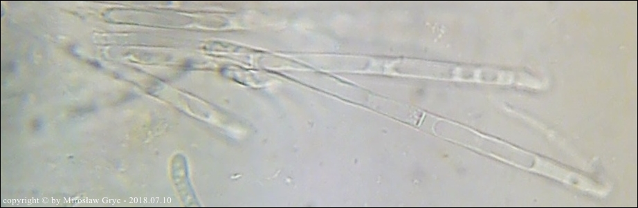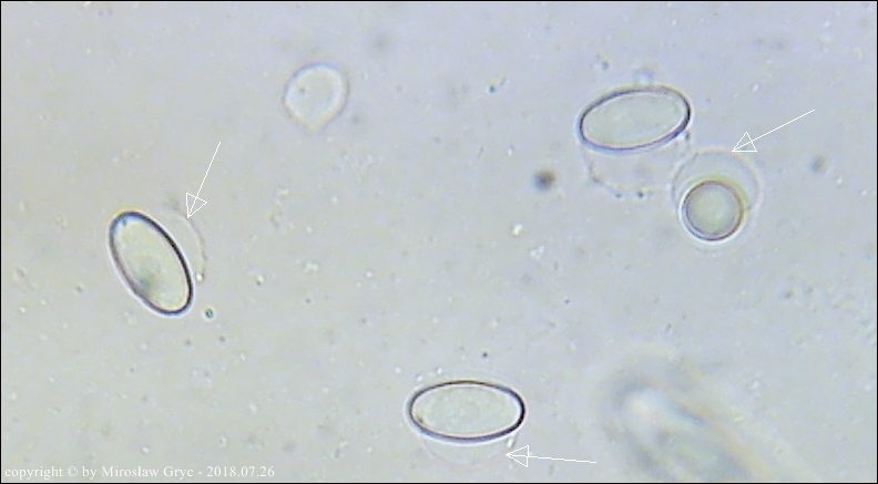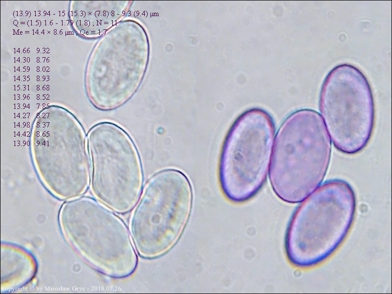 Wymiary zarodników dość kłopotliwe? Na fotografi nr. 34 przedstawiłem wymiary zarodników uzyskanych z wysypu. Zarodniki tak małe nie pasują mi do żadnego znanego gatunku o podobnych cechach. Zapewne owocnik zupełnie jeszcze niedojrzały???